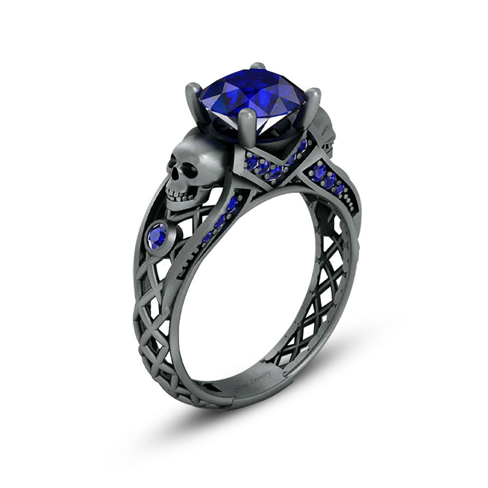 Blue Sapphire Skull Engagement Ring Mesh Skull Ring Gun Metal Finish