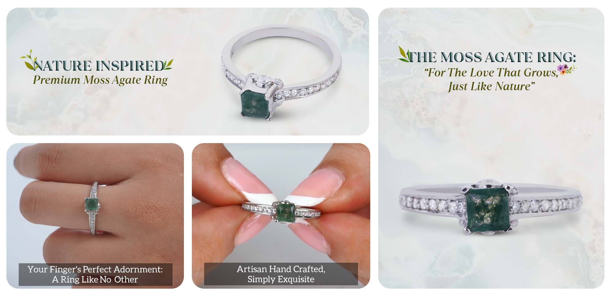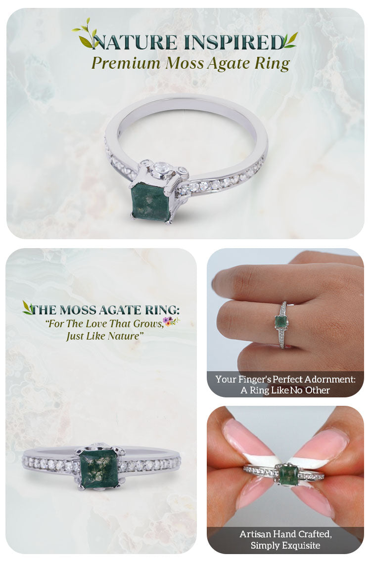 Princess Cut Moss Agate Rings Healing Gemstone Promise Ring