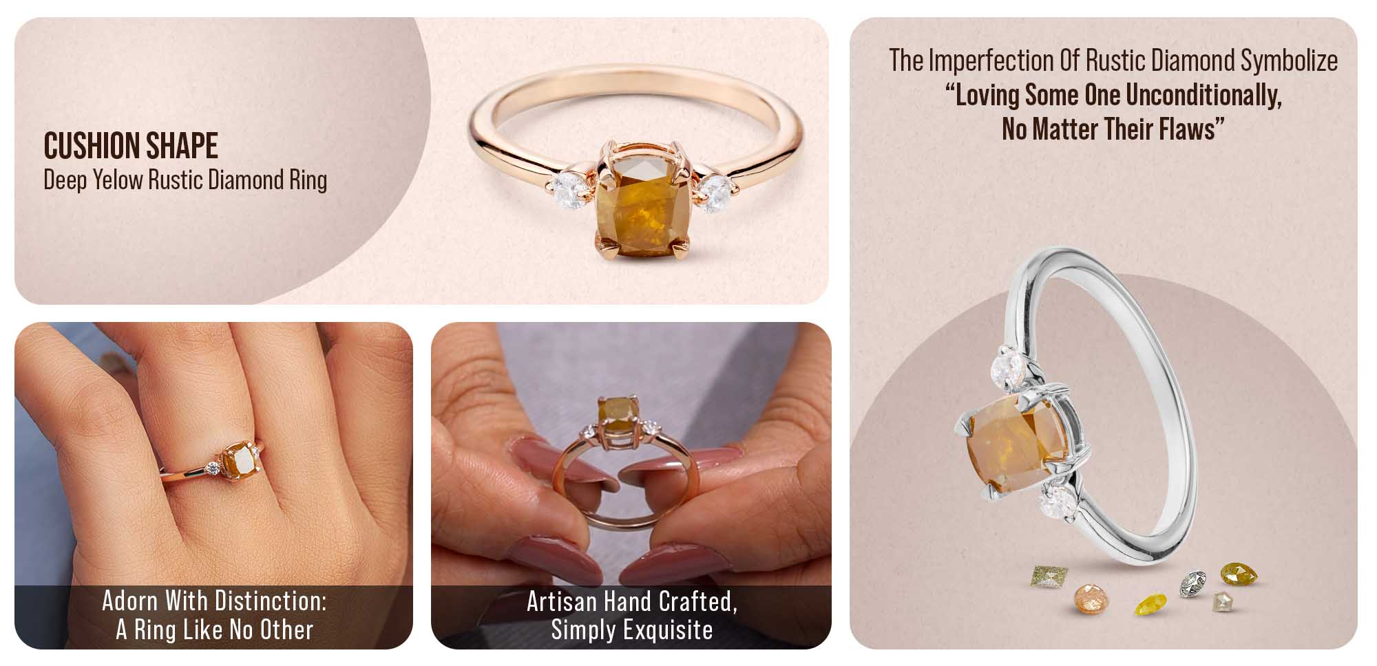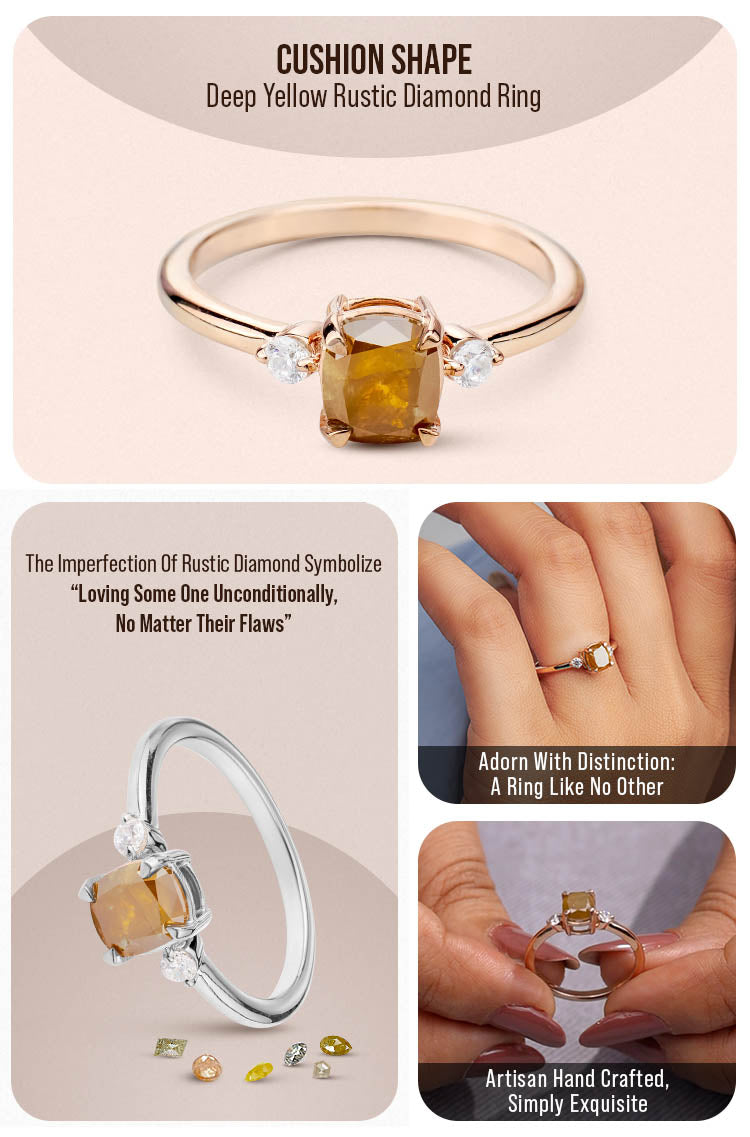 Learn moreCushion Cut Yellow Rustic Diamond 3 Stone Engagement Ring