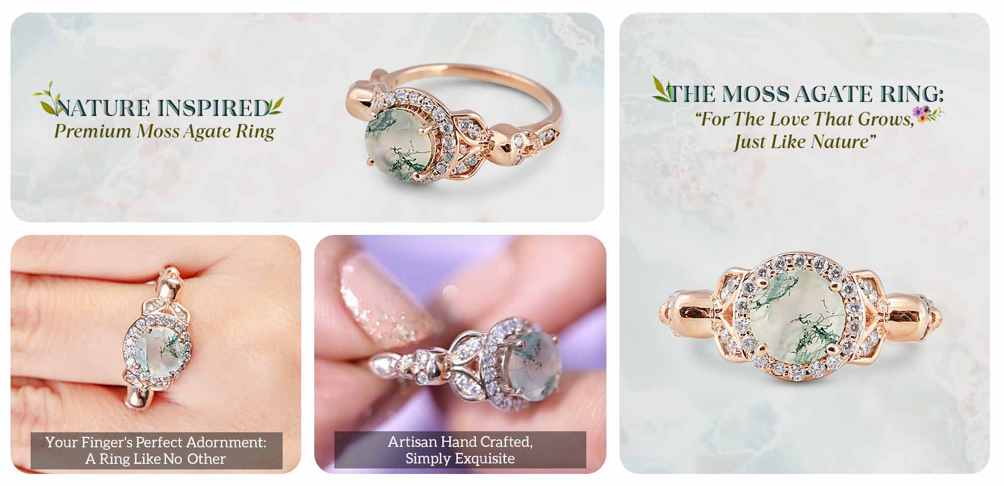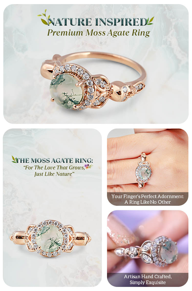 Moss Agate Skull Ring Set Gothic Engagement Ring Set Rose Gold