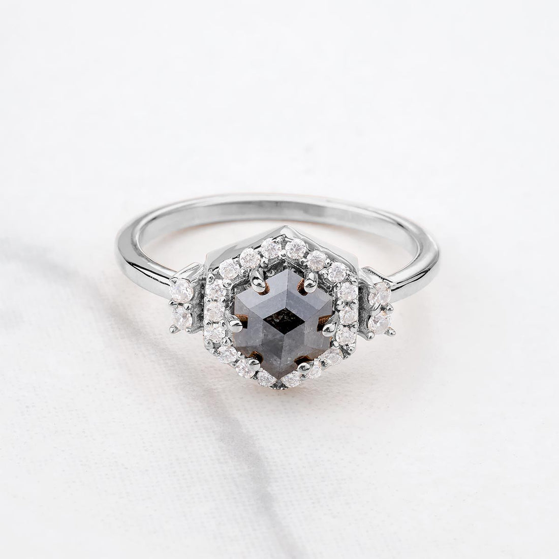 Natural Salt and Pepper Diamond Hexagon Cut Engagement Ring