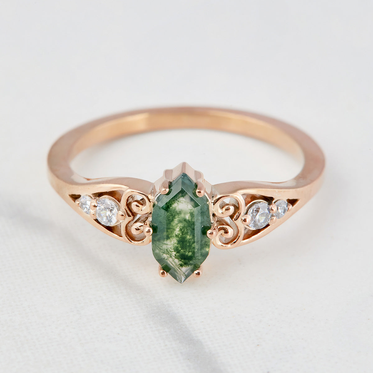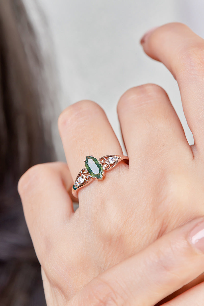 1.20CT Moss Agate Engagement Ring Women Long Hexagon Cut