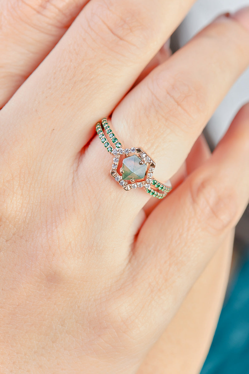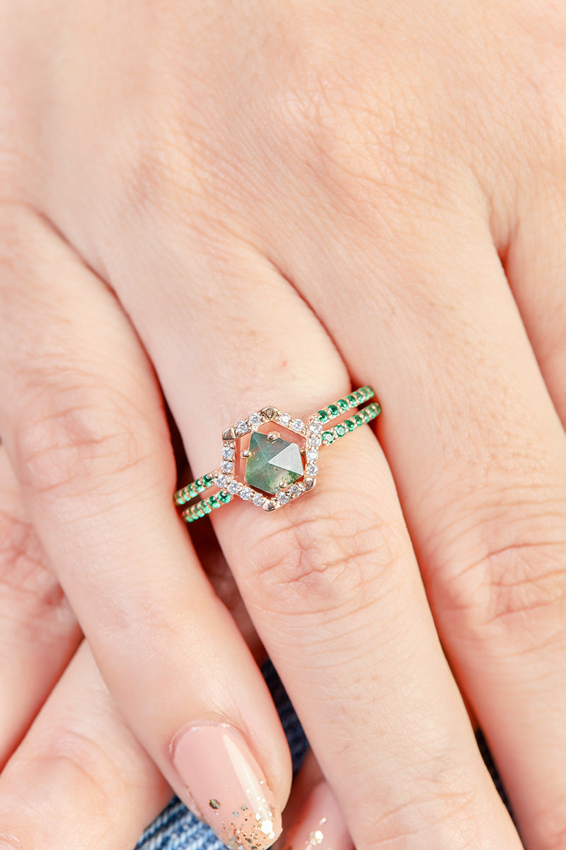 Hexagon Engagement Ring Women Pentagon Cut Moss Agate Ring