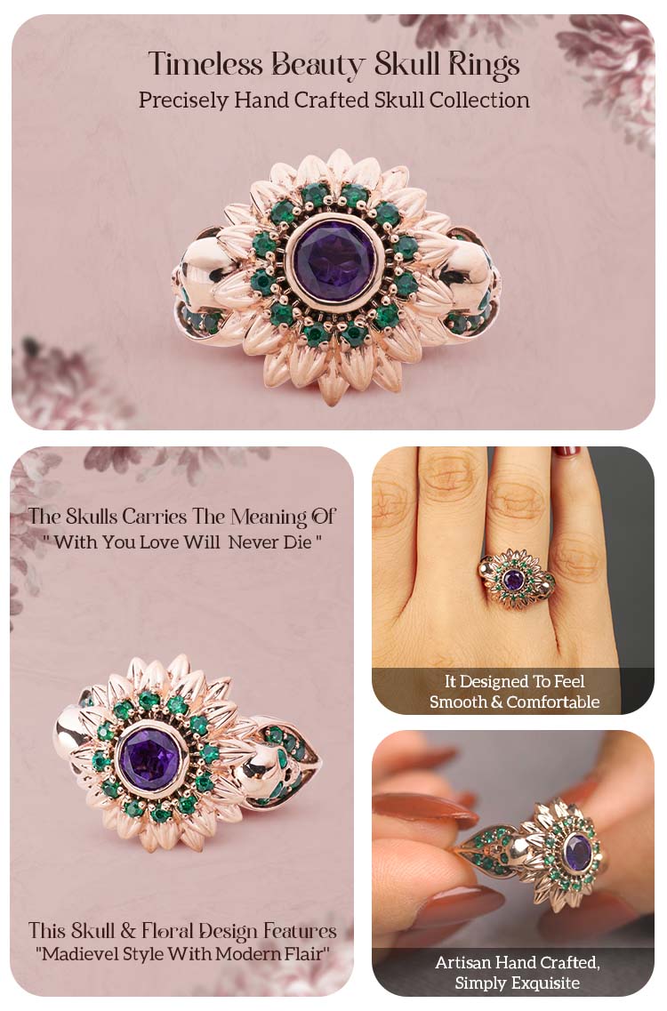 Natural Amethyst Skull Ring Flower Gothic Engagement Rings Gold