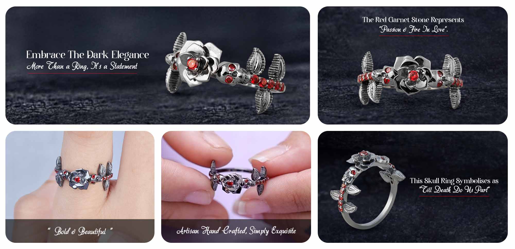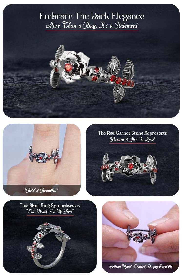 Rose Skull Engagement Ring Red Garnet Flower Gothic Gun Metal