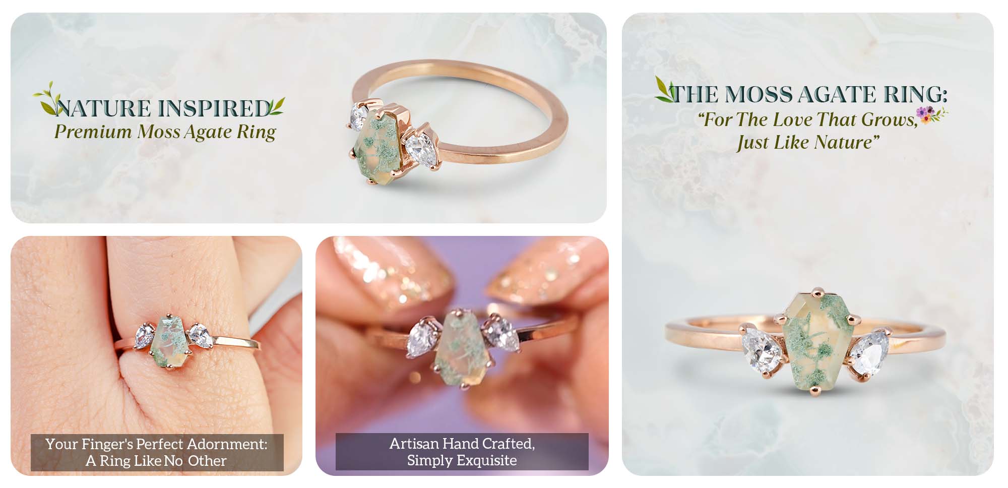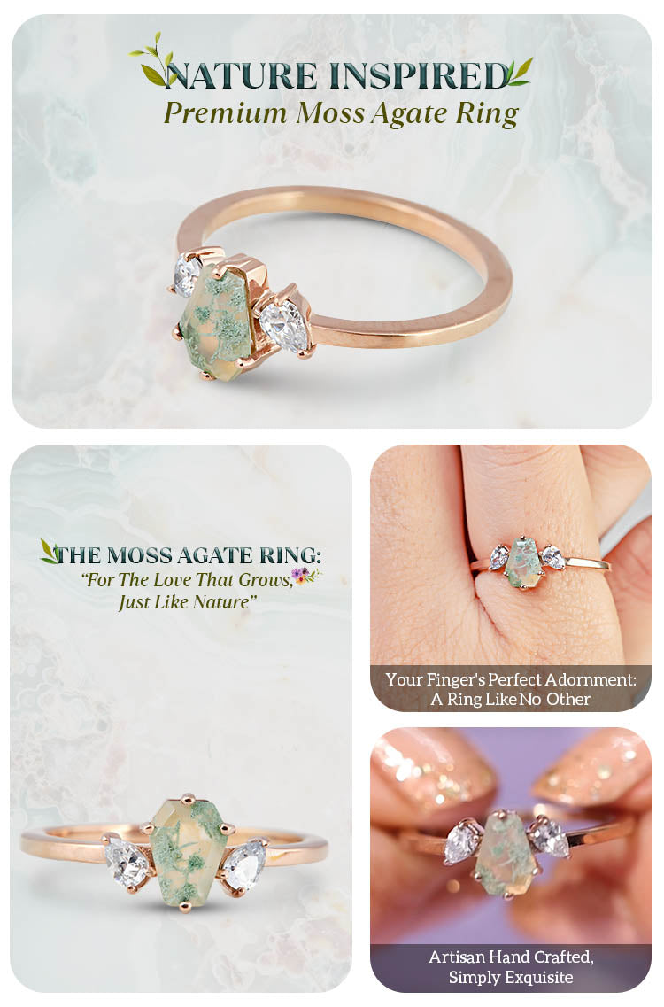 Coffin Cut Moss Agate Engagement Ring Pear Moissanite 3 Stone