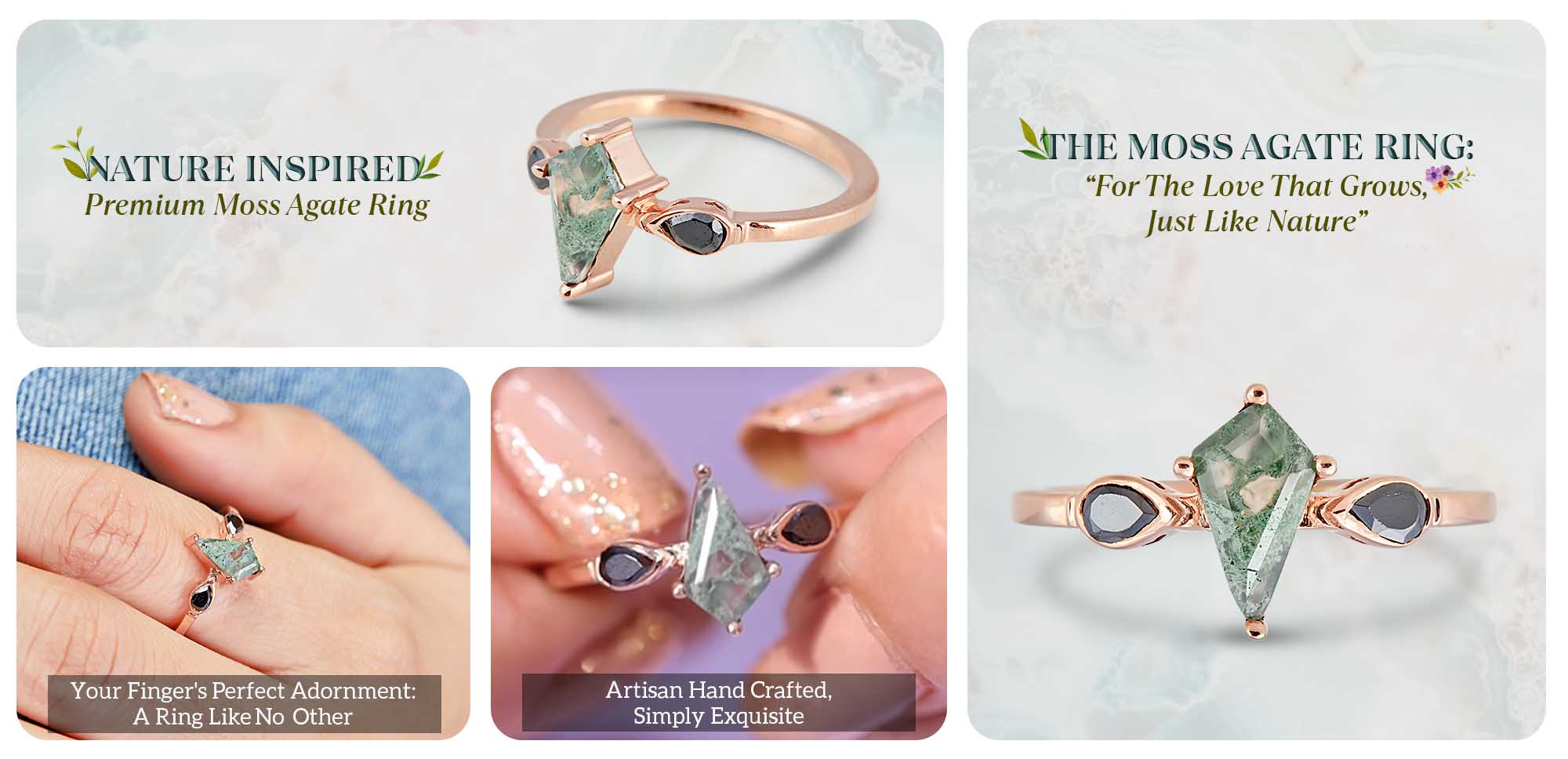 Kite Moss Agate Wedding Ring Set Rose Gold Engagement Rings