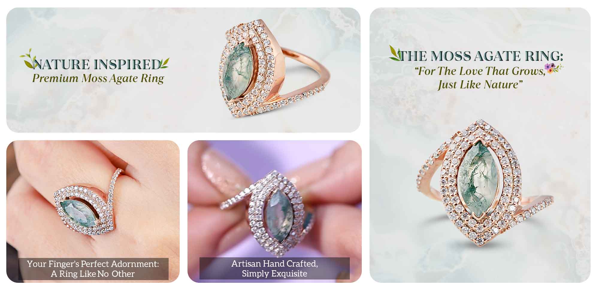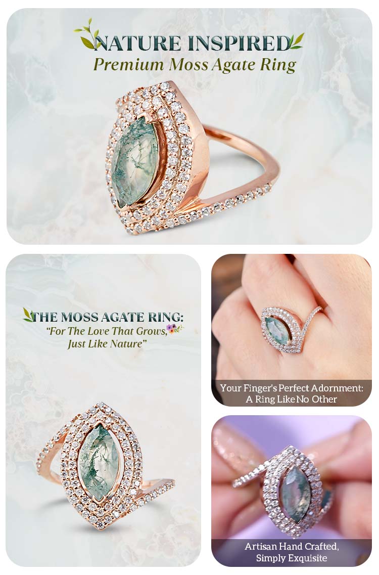 Learn moreMoss Agate Double Halo Engagement Ring Womens Marquise Cut