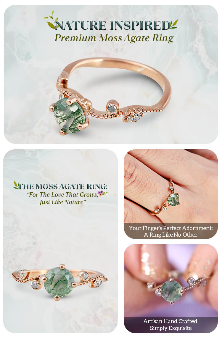 Natural Moss Agate Engagement Ring Leaf Vine Floral Ring Gold