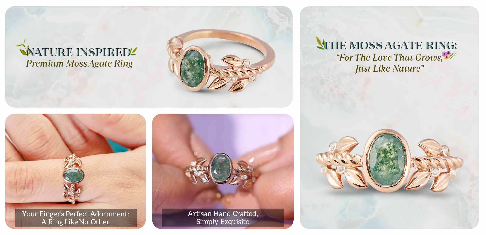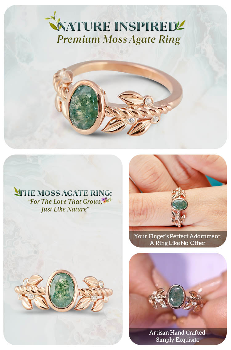 Oval Cut Moss Agate Ring Leaf Vine Nature Engagement Ring Her