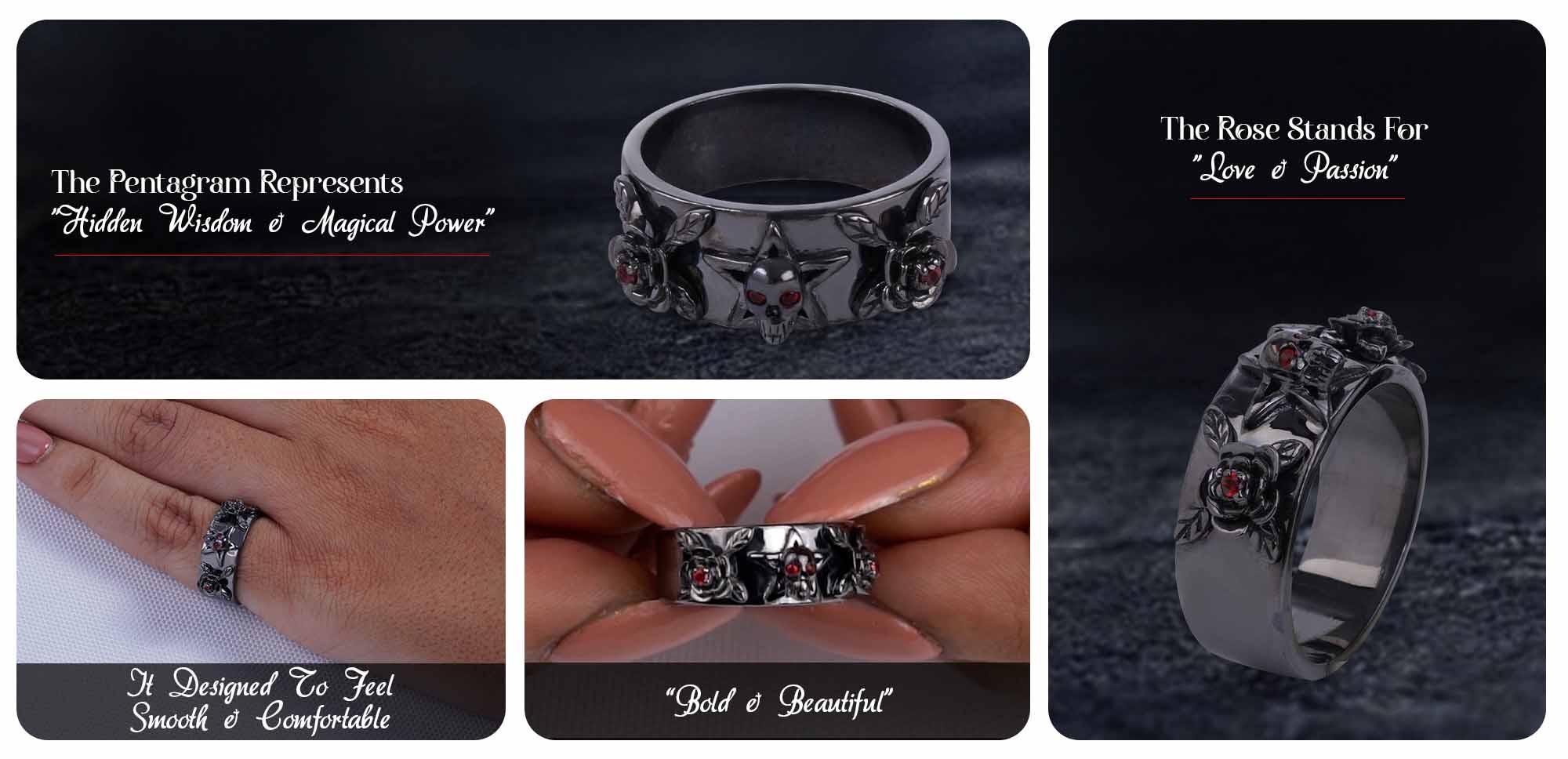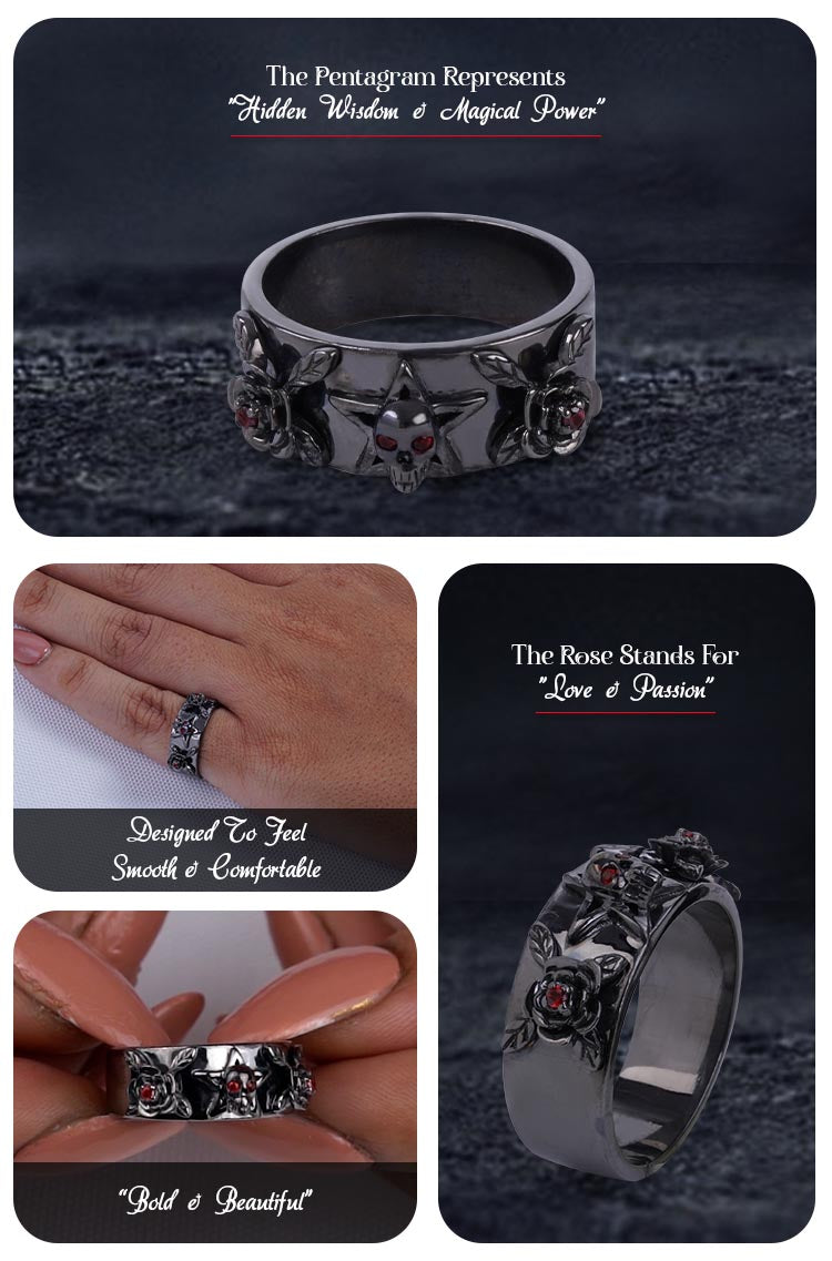 Learn morePentagram Skull and Rose Ring Bold Gothic Wedding Band for Her