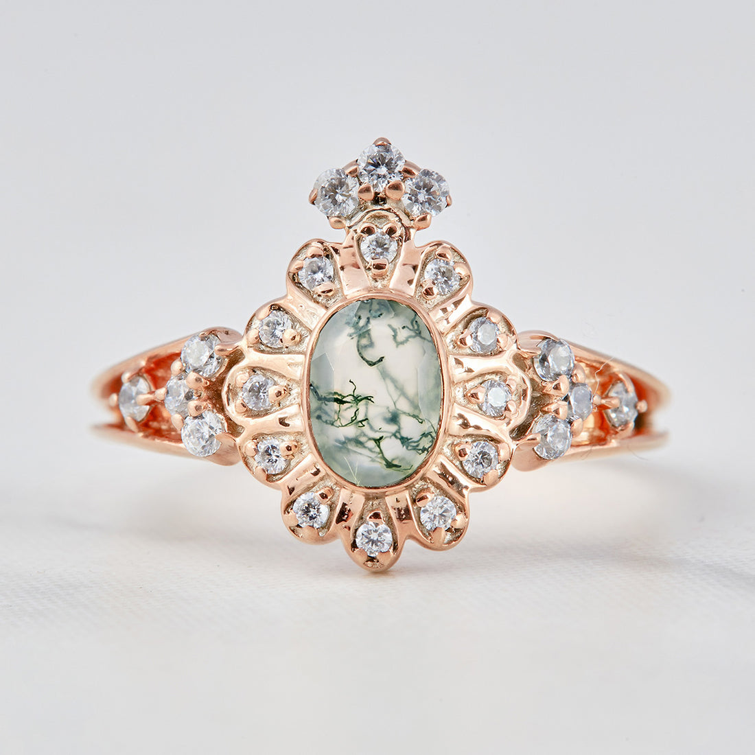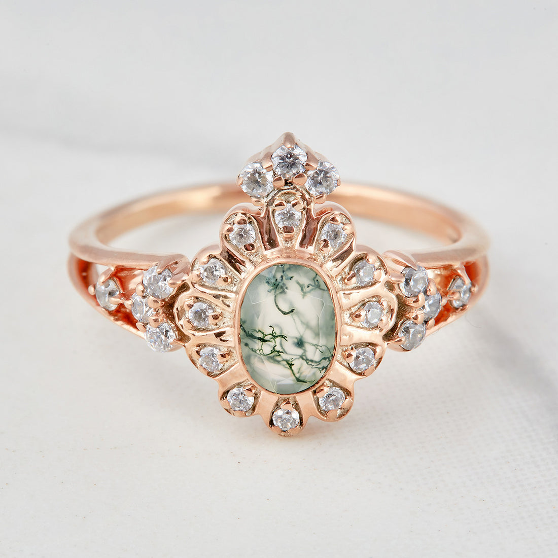 Double Halo Moss Agate Engagement Ring For Women Rose Gold