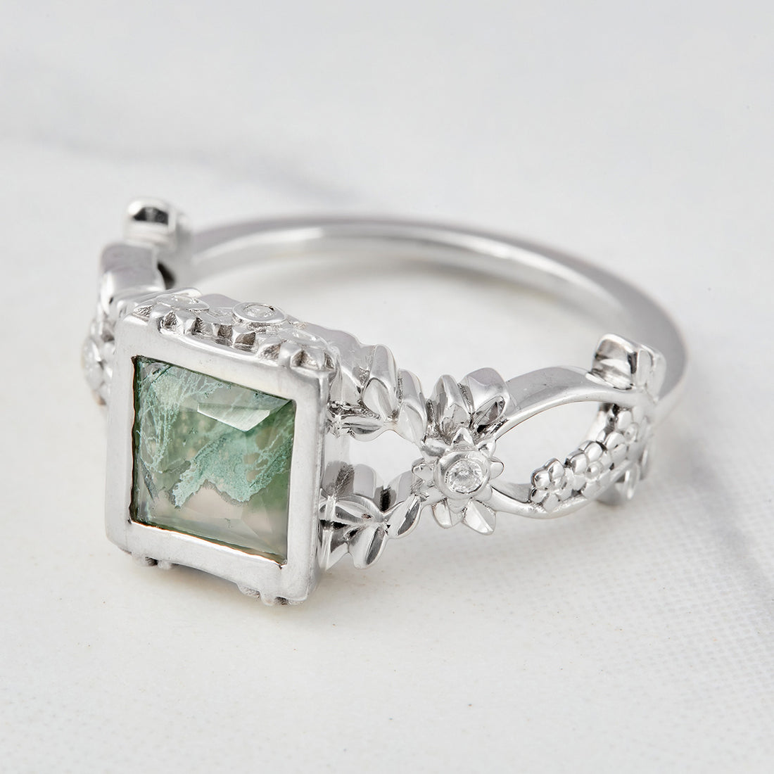 Flower Moss Agate Engagement Ring Leaf Vine Nature Inspired