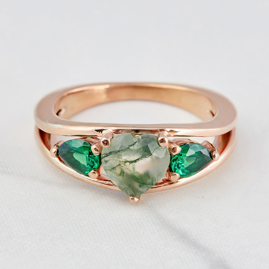 Heart Moss Agate Engagement Ring Pear Emerald 3 Stone Ring