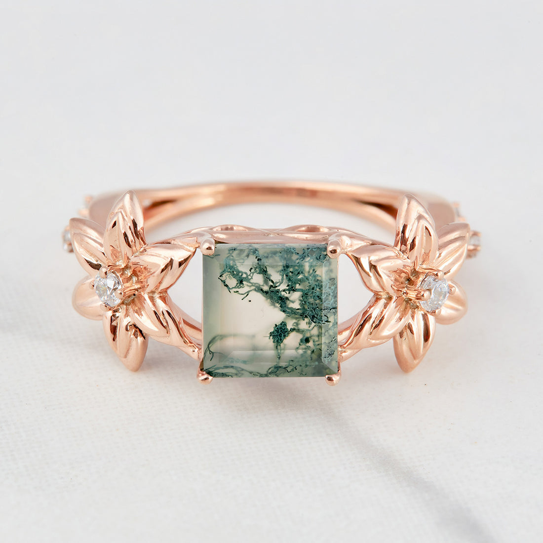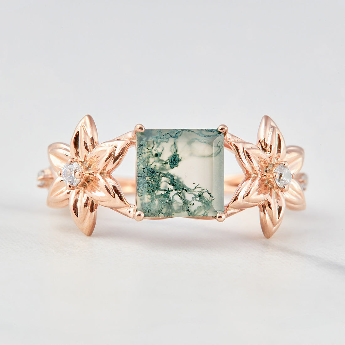 Moss Agate Flower Engagement Ring Princess Cut Nature Rings