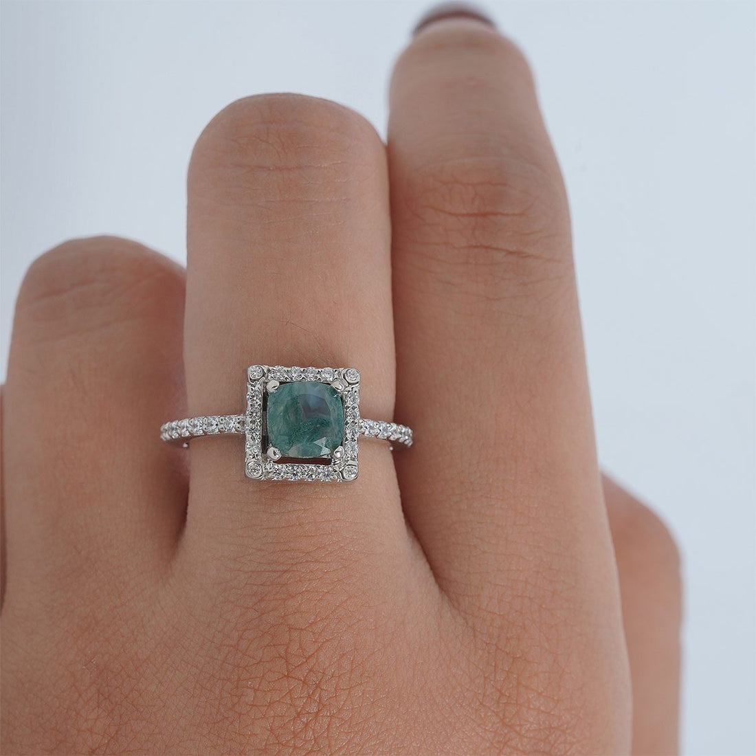 Cushion Cut Moss Agate Ring Halo Moissanite Engagement Ring