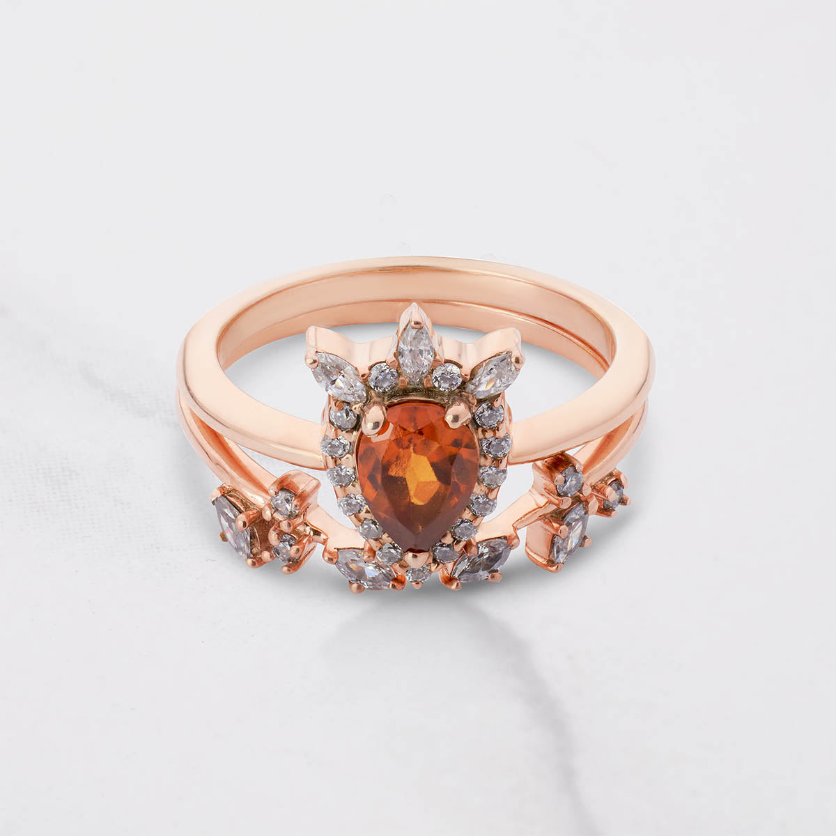 Hessonite Engagement Ring Teardrop Bridal Set 14k Rose Gold