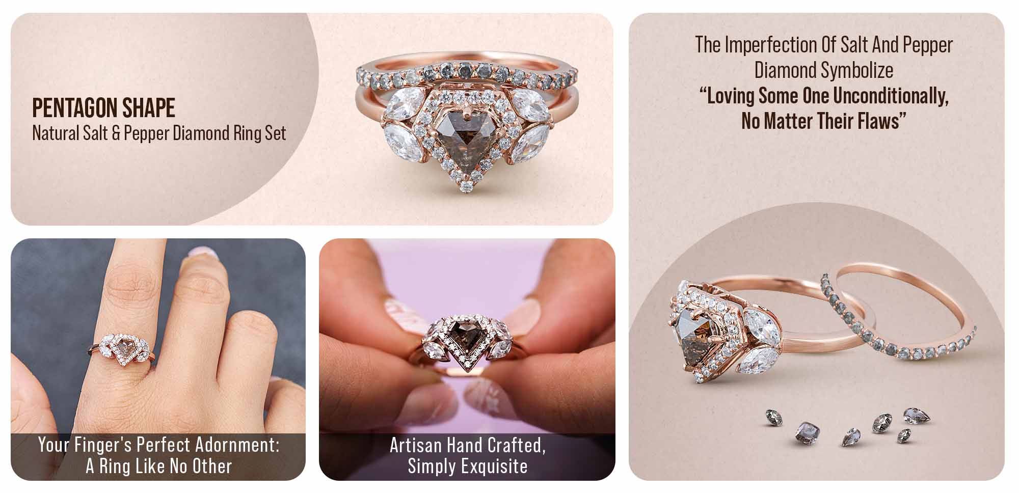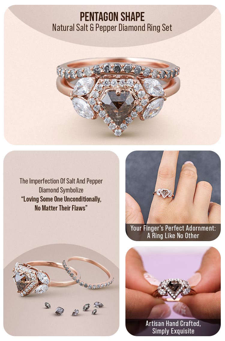 Pentagon Salt and Pepper Natural Diamond Engagement Ring Set