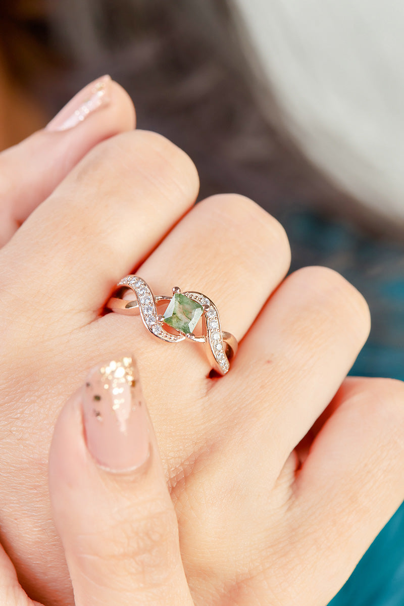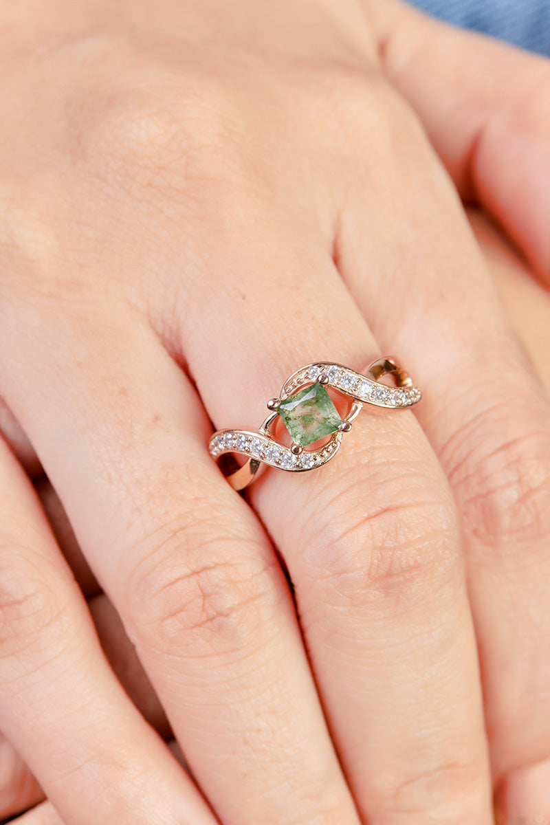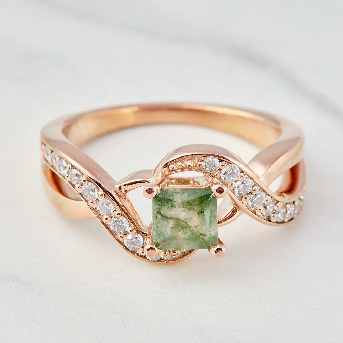 Princess Cut Moss Agate Engagement Ring Moissanite Rose Gold