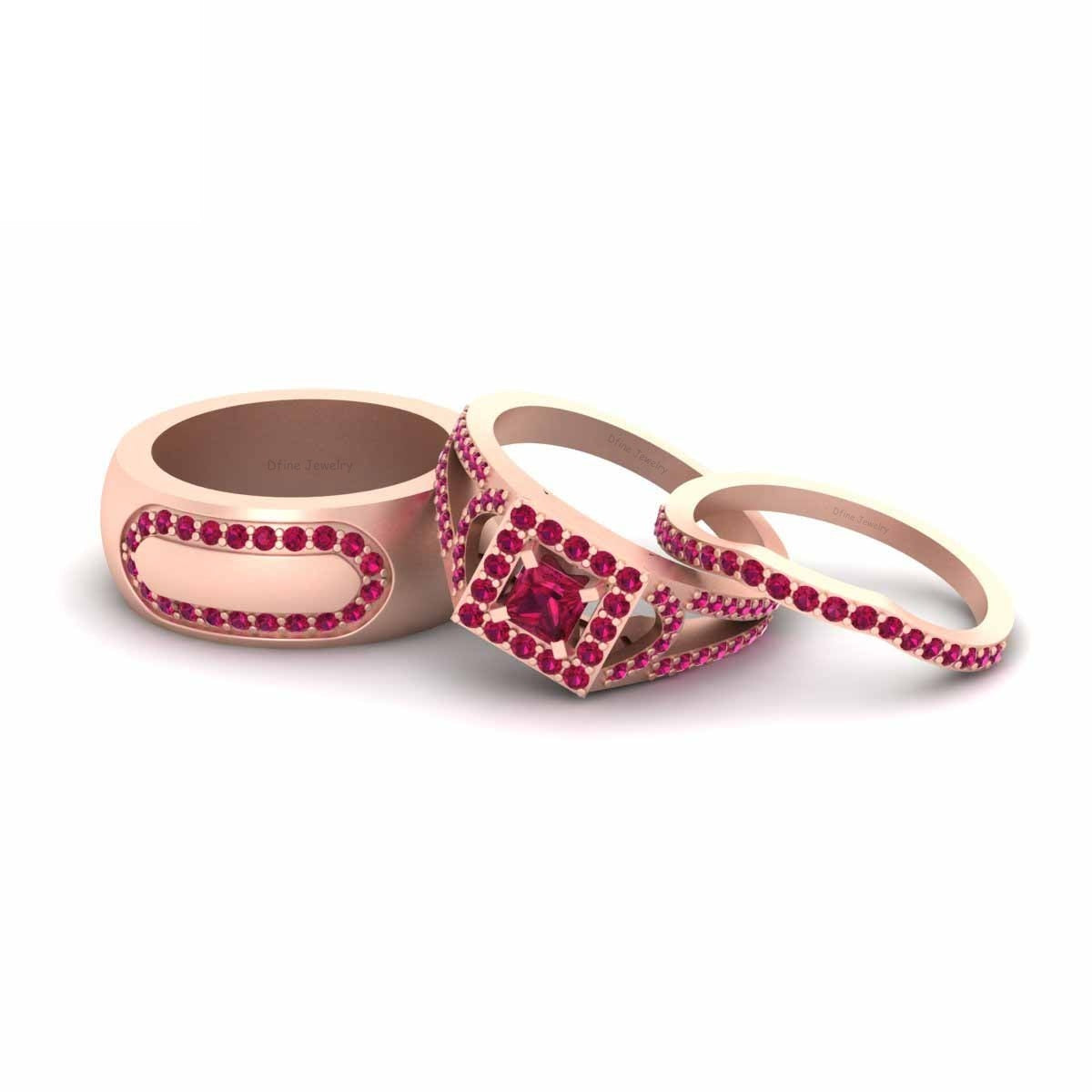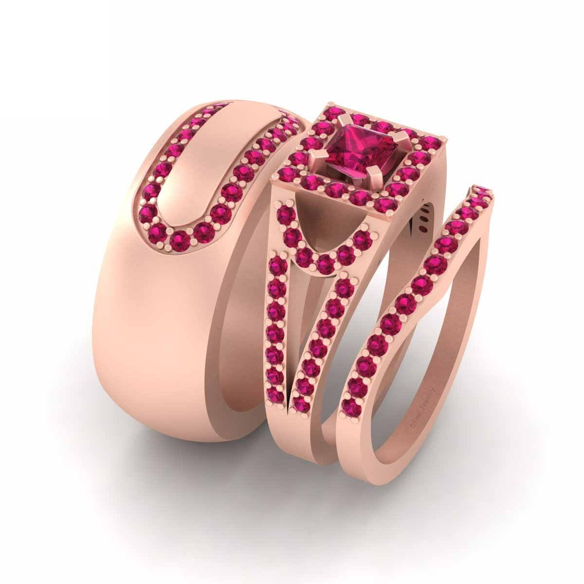 Rose Gold Engagement Ring Set His and Her Couple Rings 3Piece