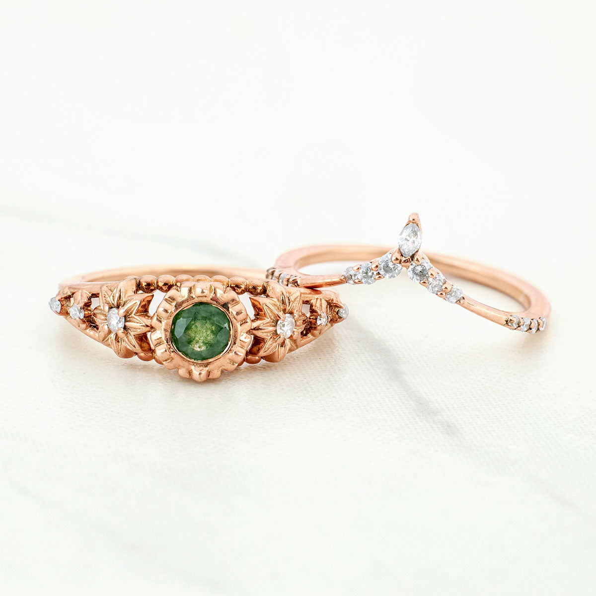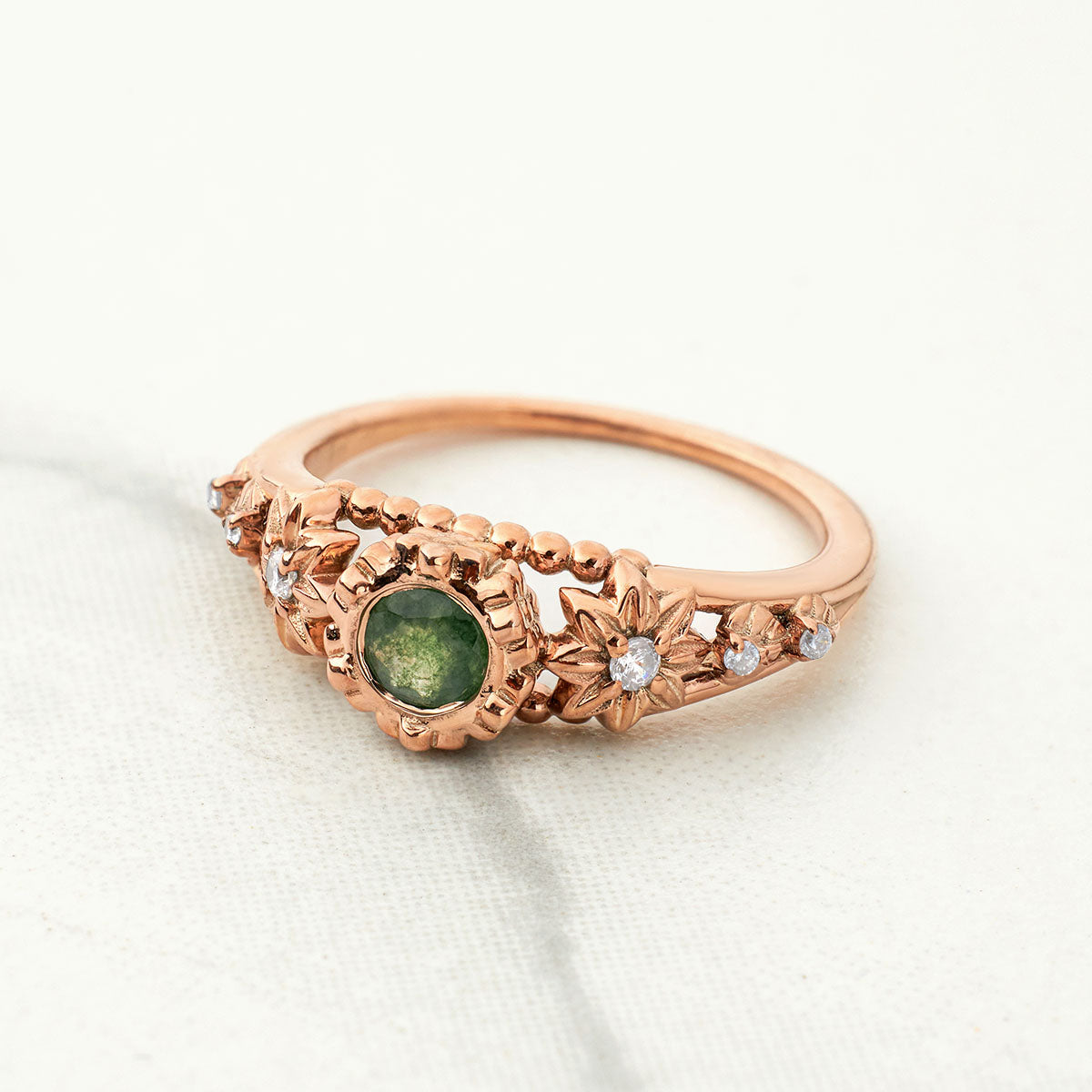 Rose Gold Flower Moss Agate Ring Floral Bridal Wedding Ring Set
