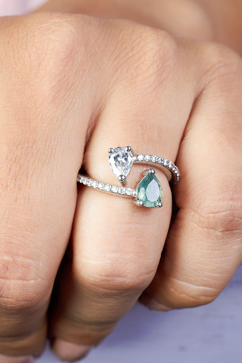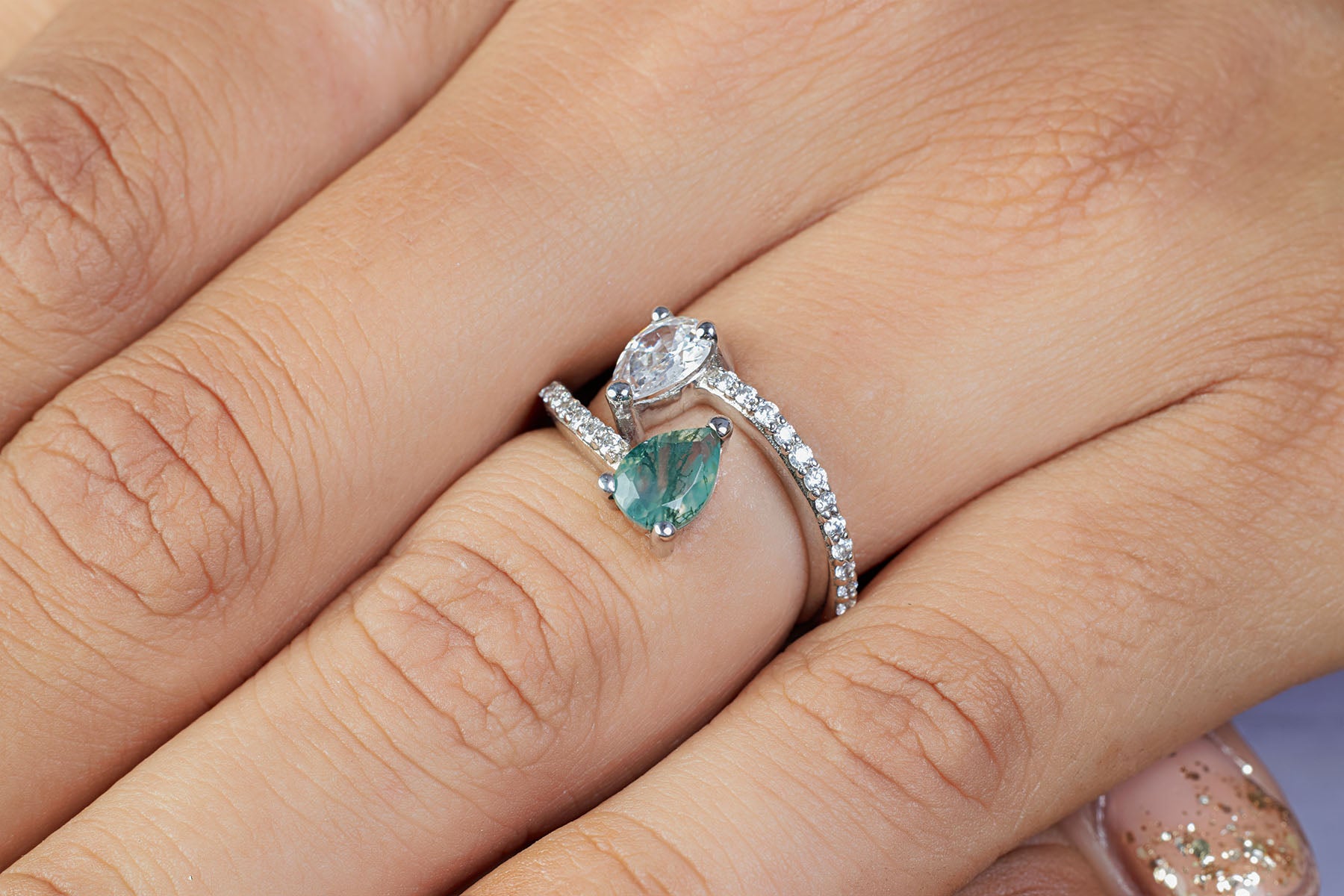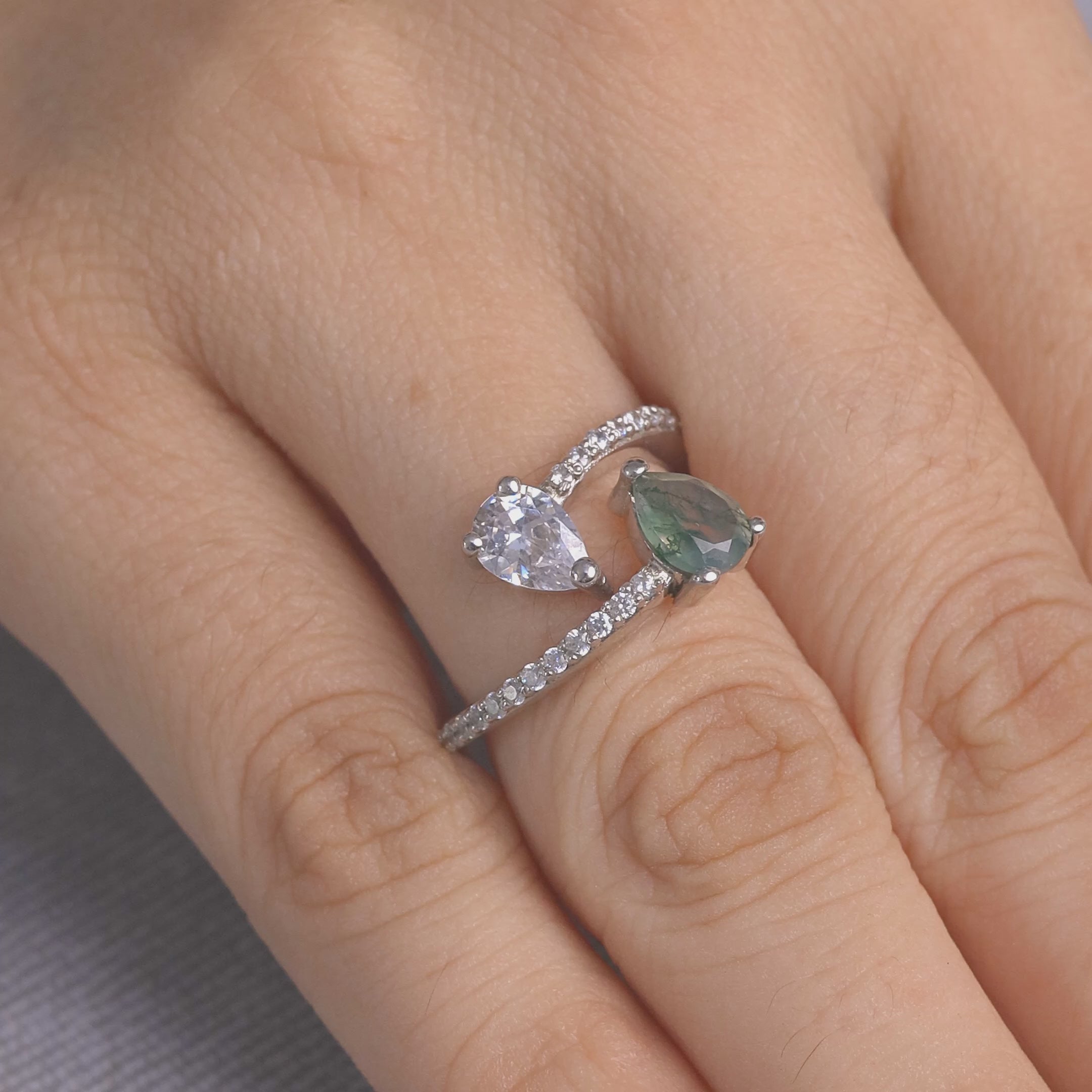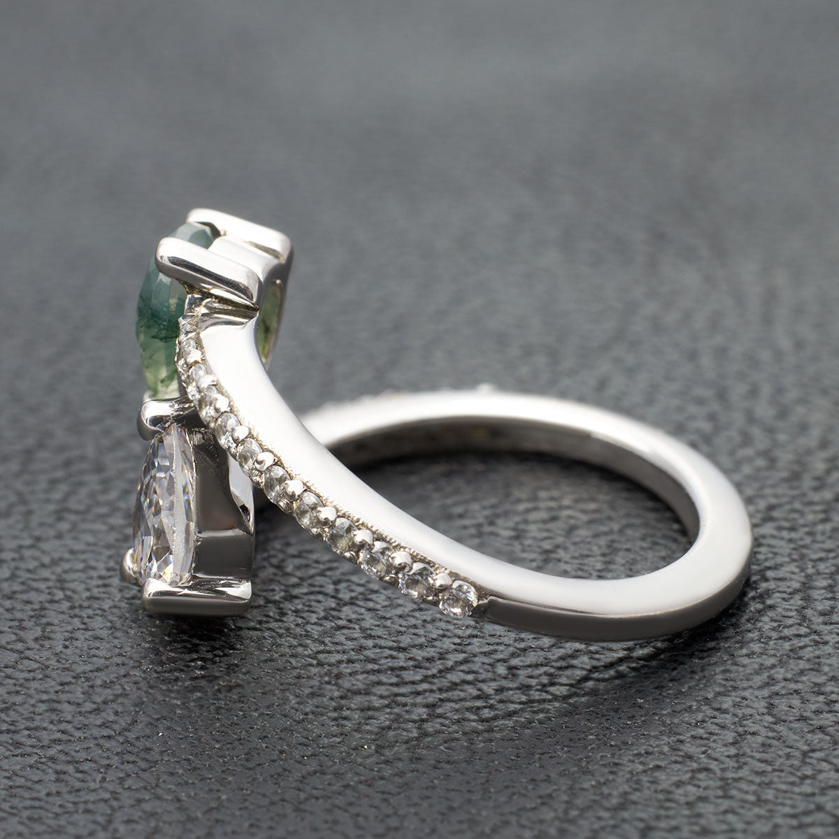 Toi Et Moi Moss Agate Engagement Ring Pear Cut 2 Stone Silver