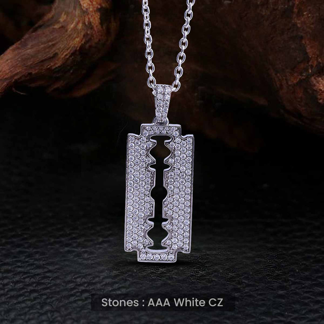 Iced Out Razor Blade Pendant Necklace Features Double Edge Razor Blade Shaped Pendant Made of...