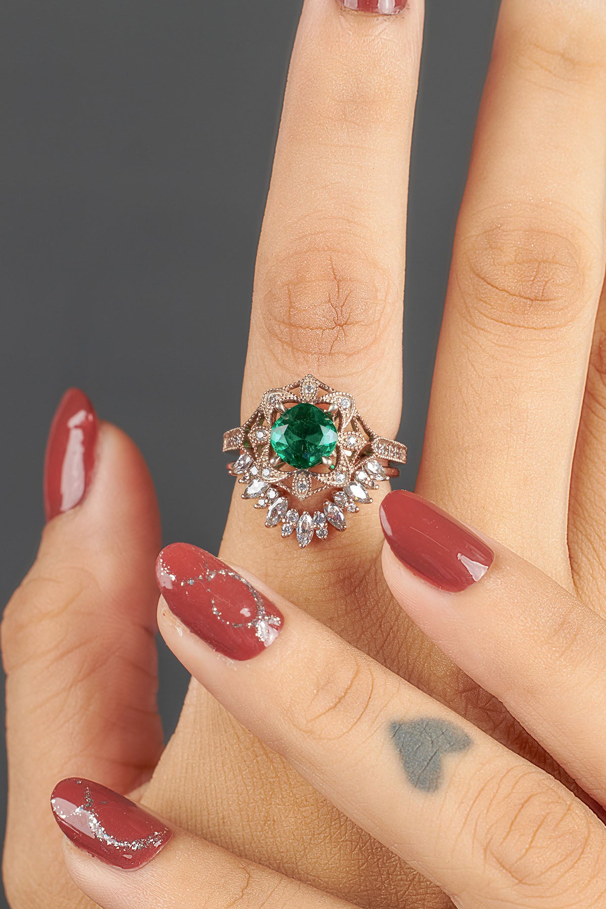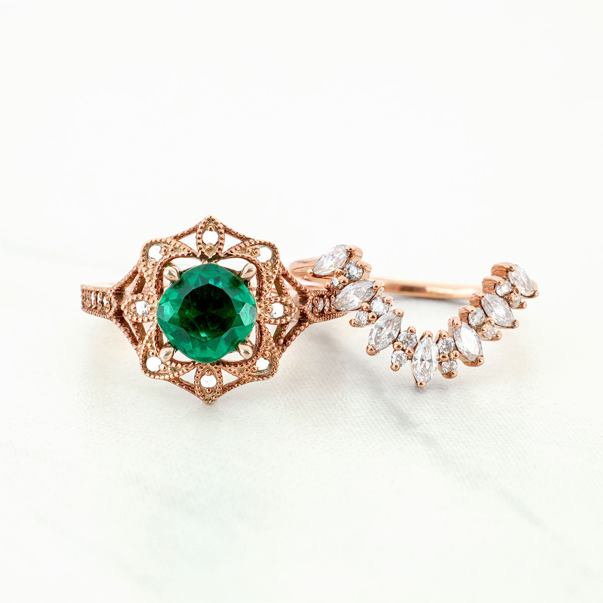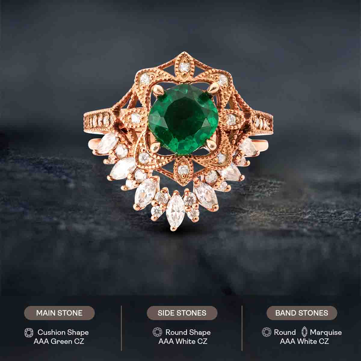 Learn moreMilgrain Art Deco Engagement Ring Set Green Emerald Vintage Bridal Rings