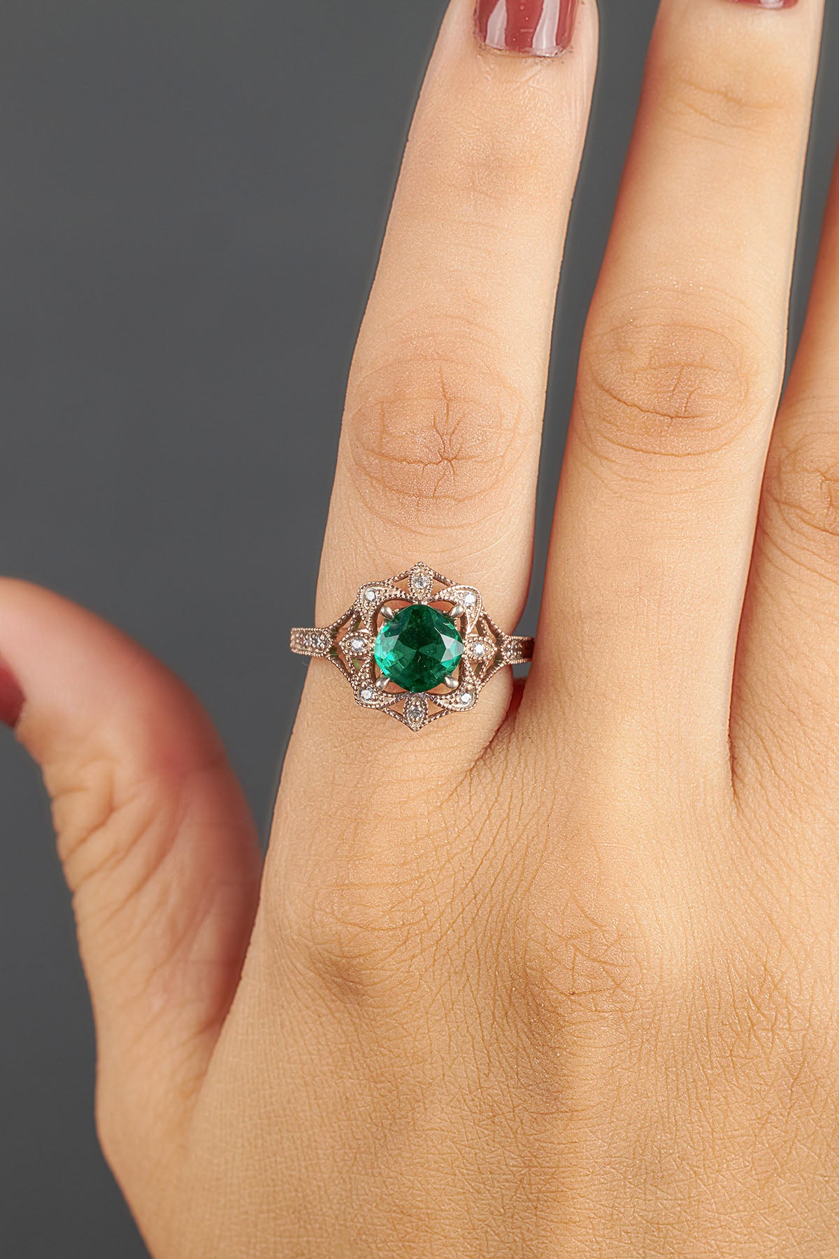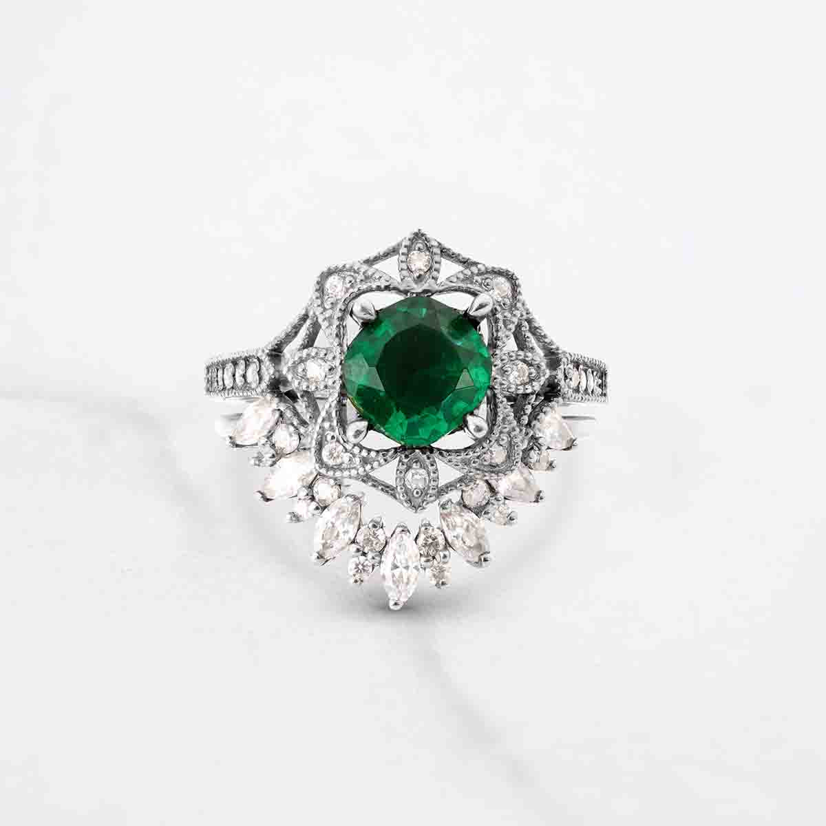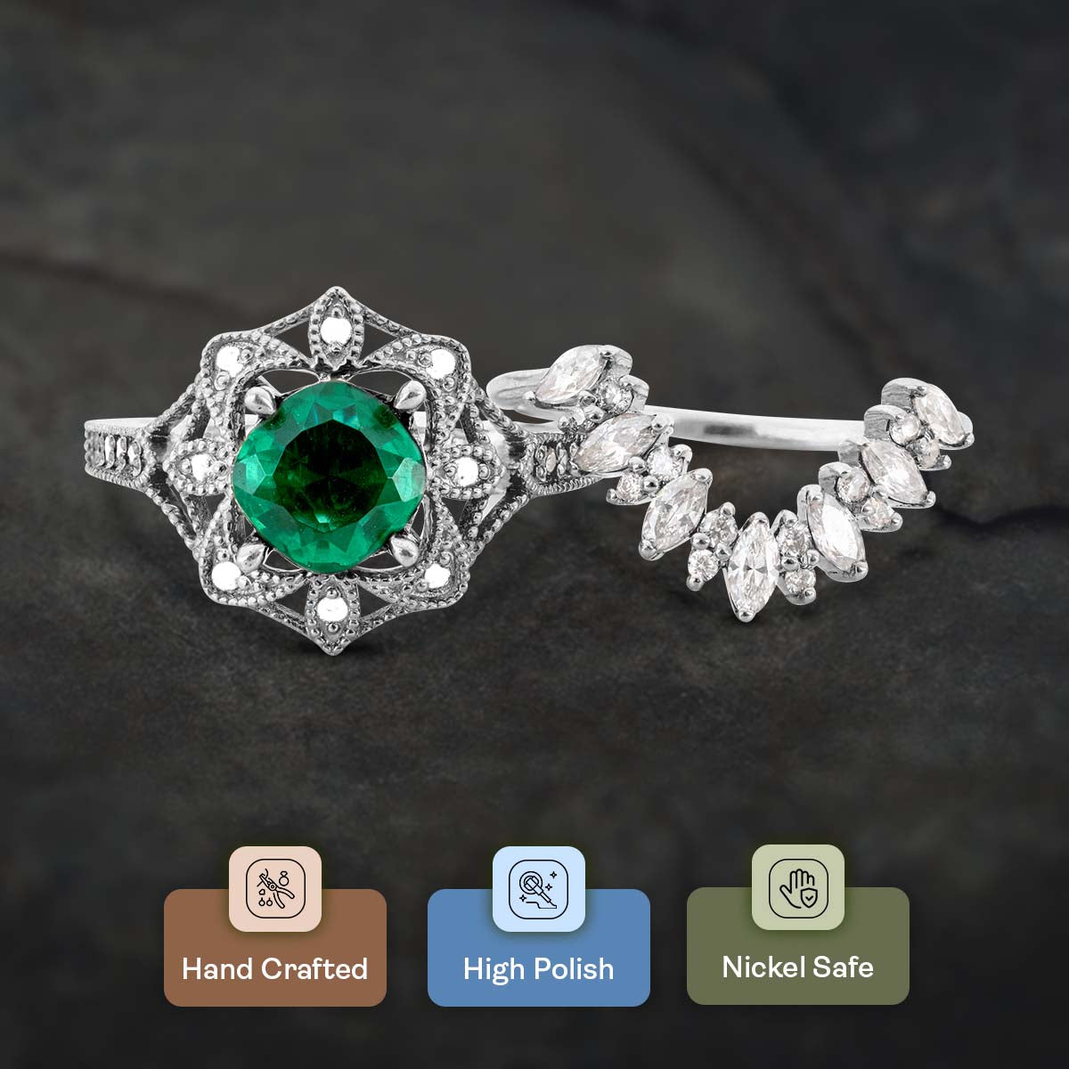 Natural Emerald Art Deco Wedding Ring Set Moissanite Band