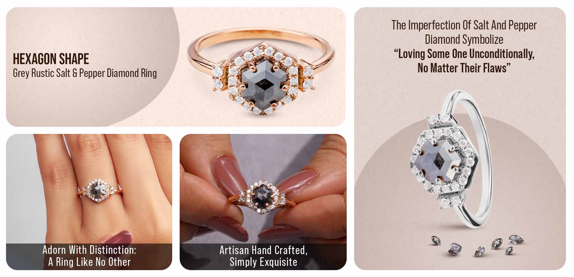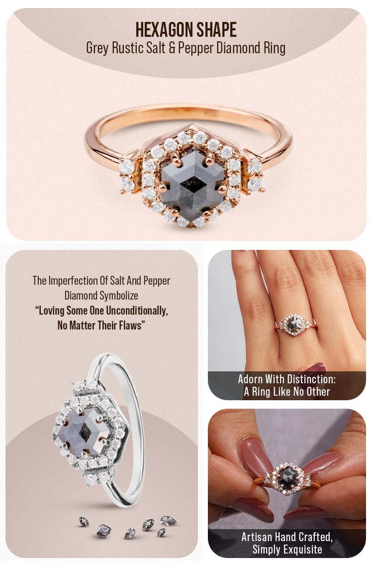 Hexagon Cut Grey Natural Rustic Salt and Pepper Diamond Ring