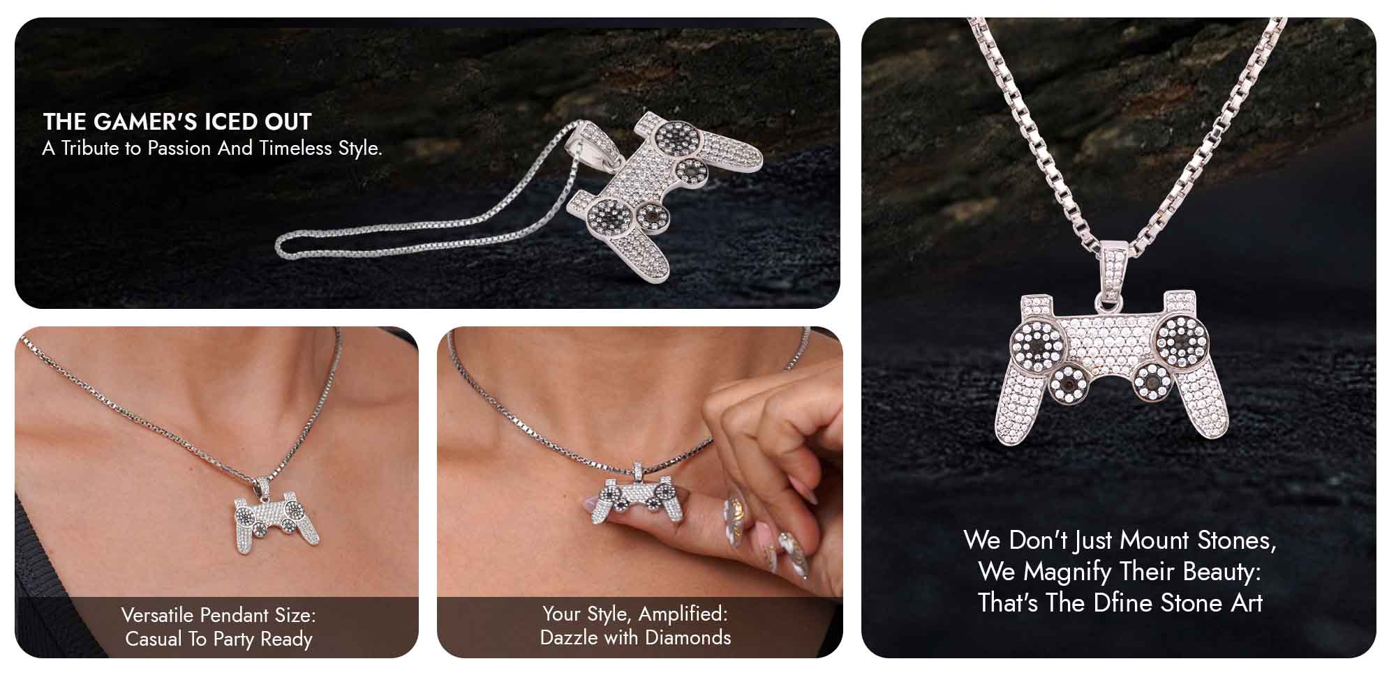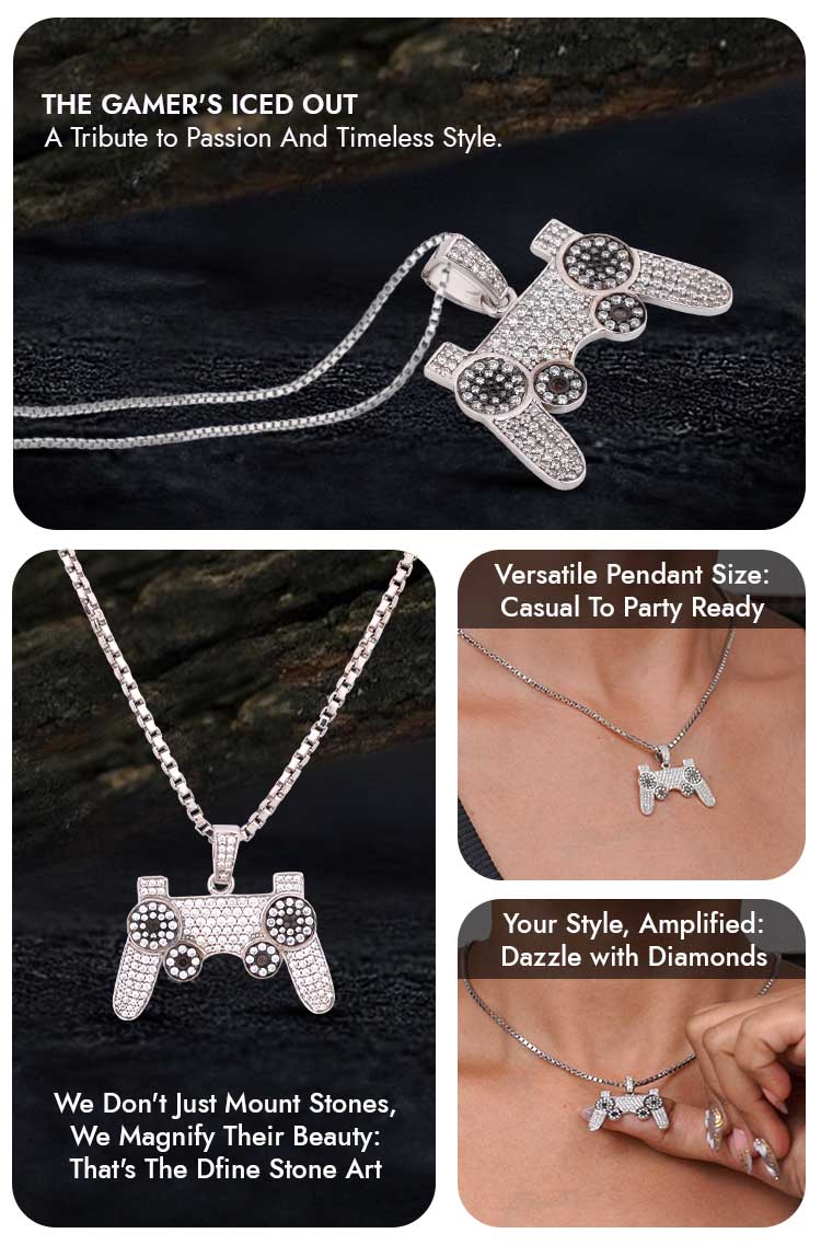 Video Game Controller Necklace Two Tone Silver Iced Out Gaming Pendant