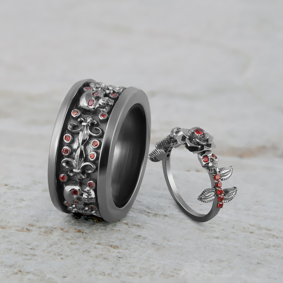 Rose Skull Ring Matching Gothic Wedding Band Couple Set Gun Metal