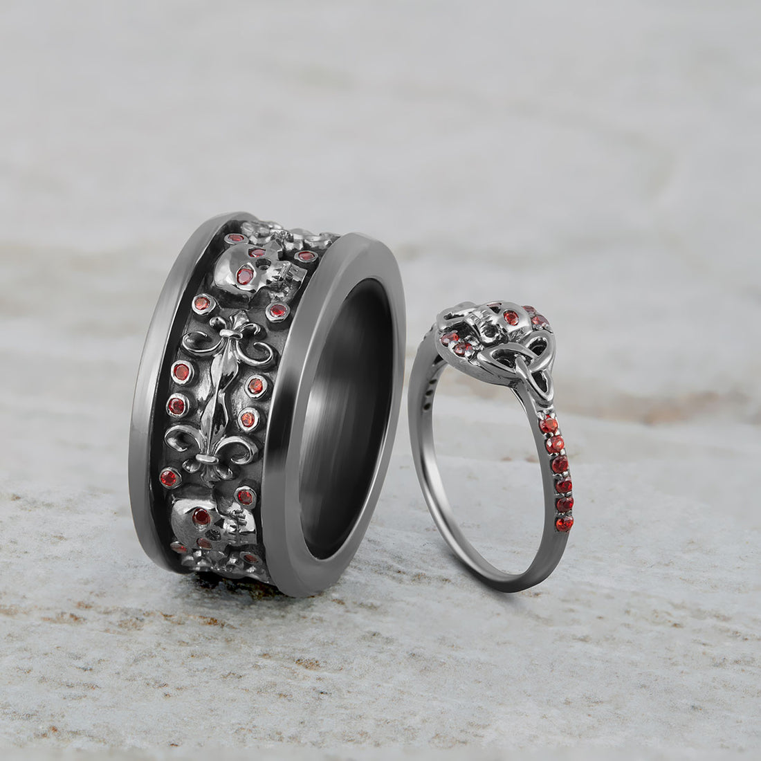 Garnet Skull Wedding Ring Set Fleur De Lis Skull Rings Couples