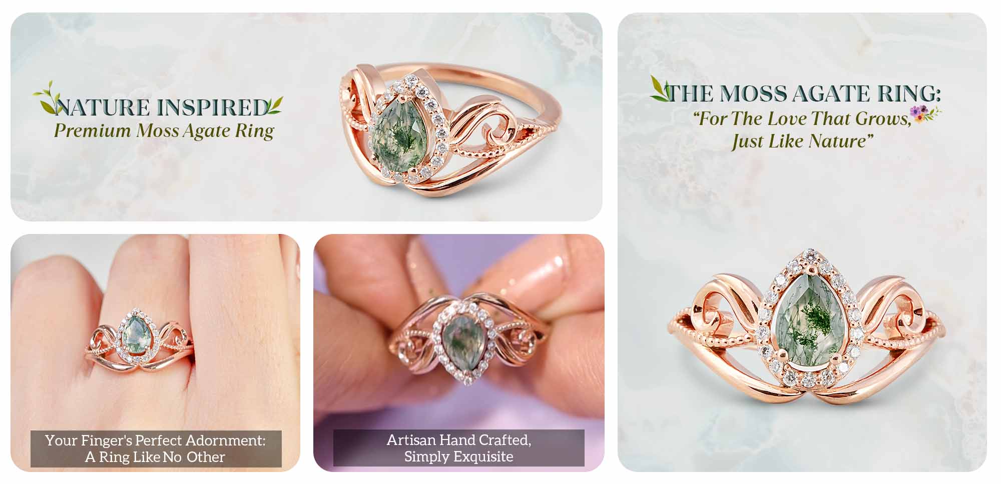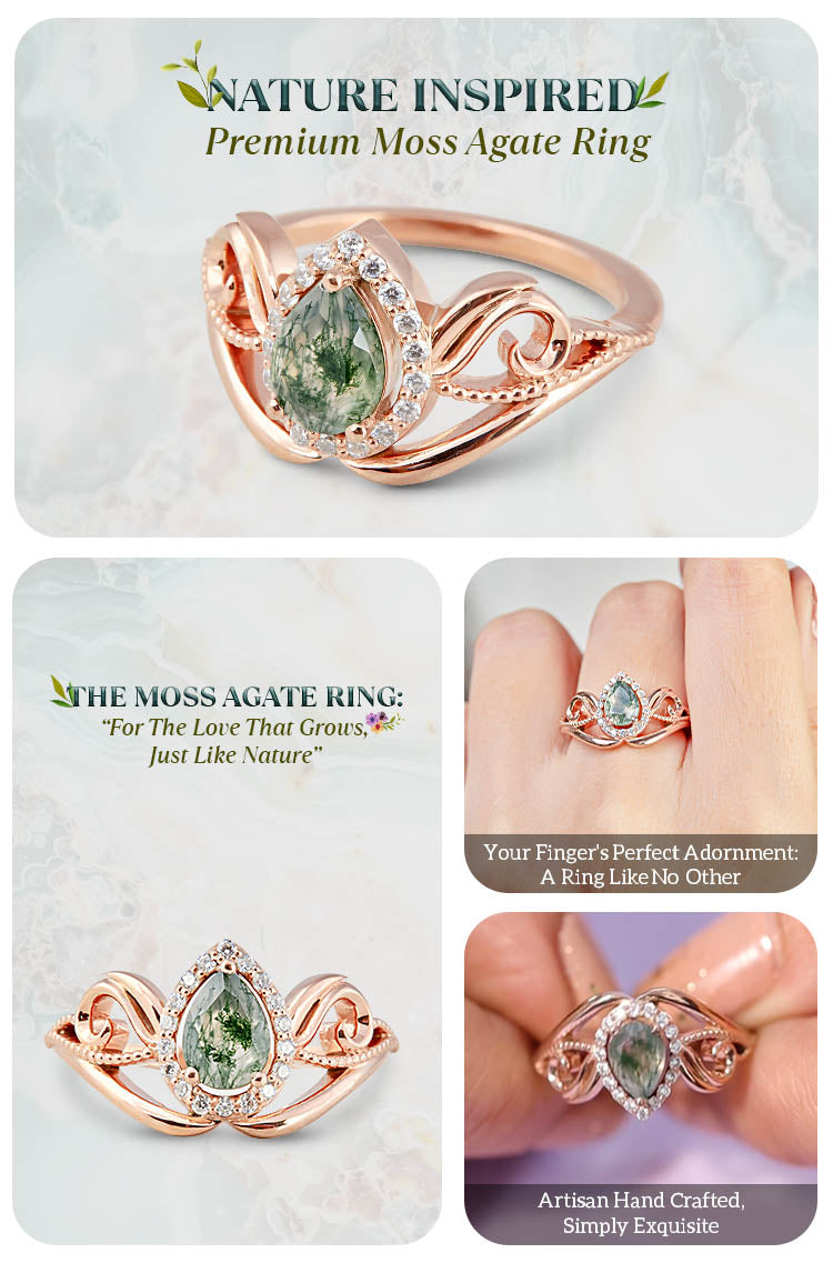 0.65CT Moss Agate Engagement Ring Halo Moissanite Floral Ring