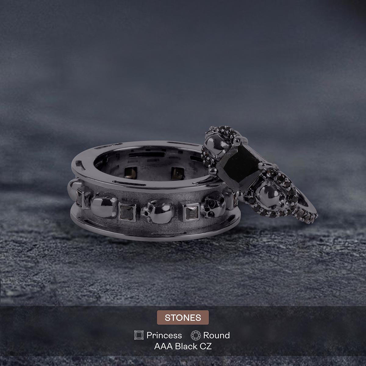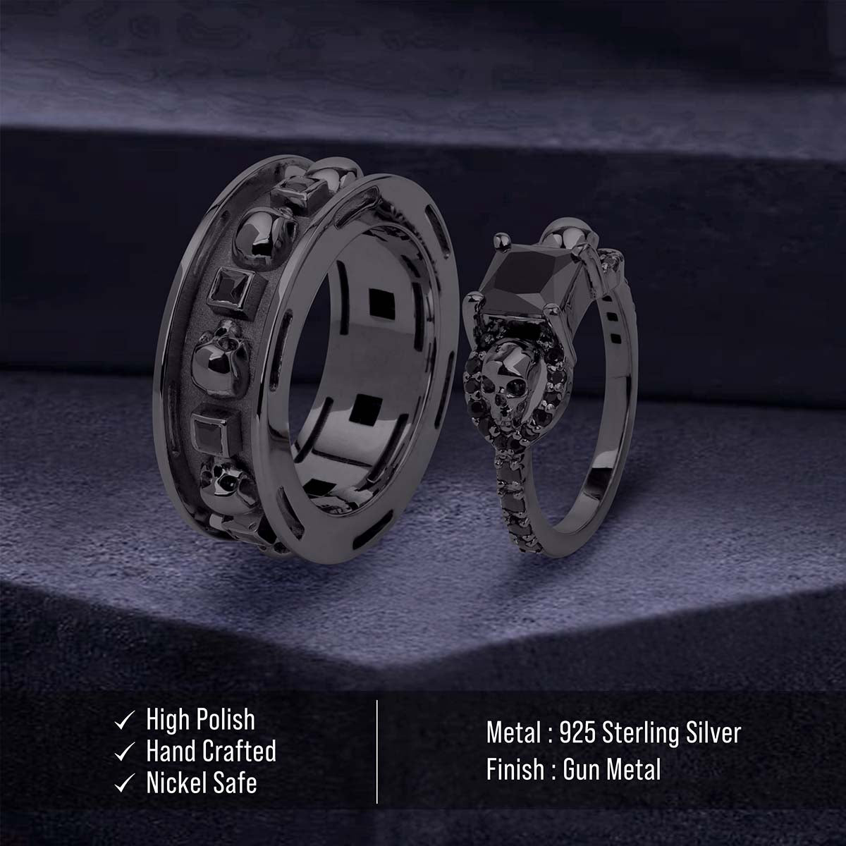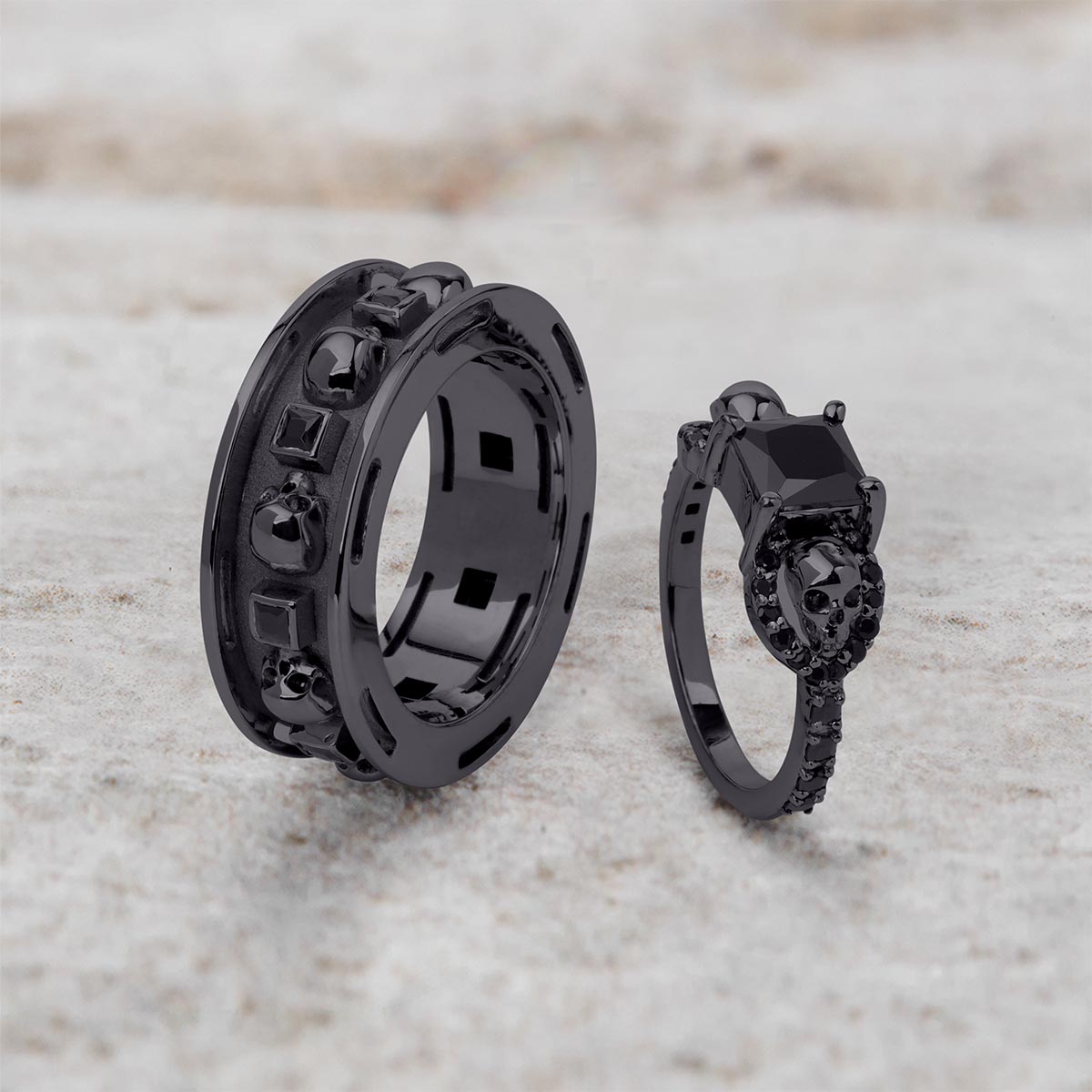 Black Spinel Skull Couple Rings Gothic Wedding Ring Set His Her