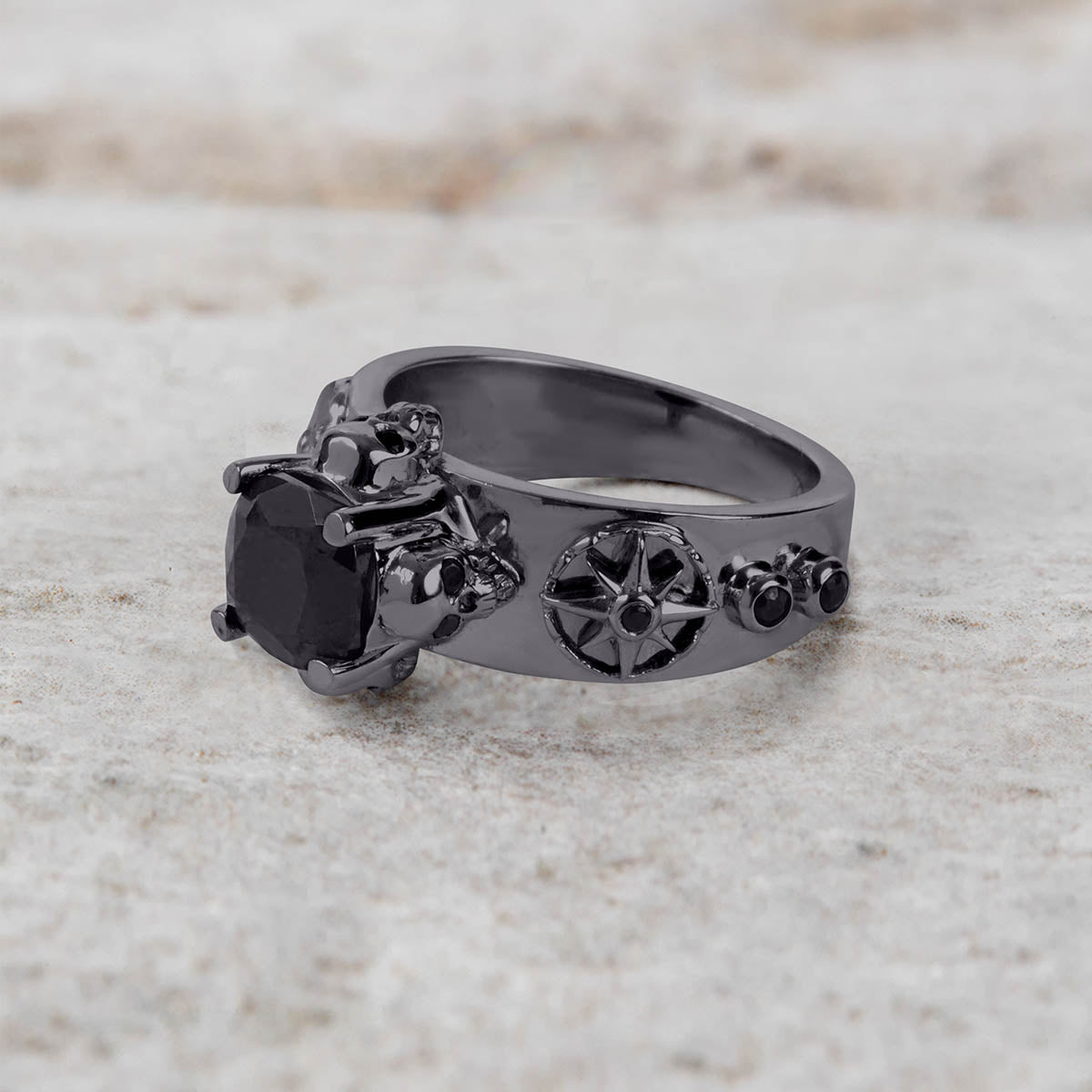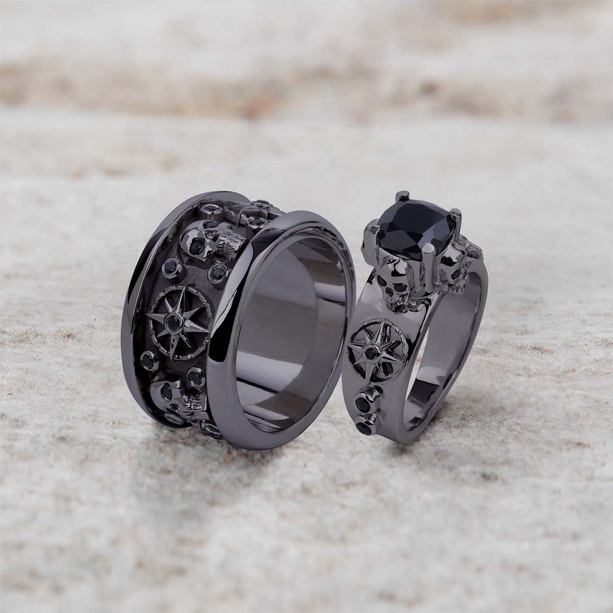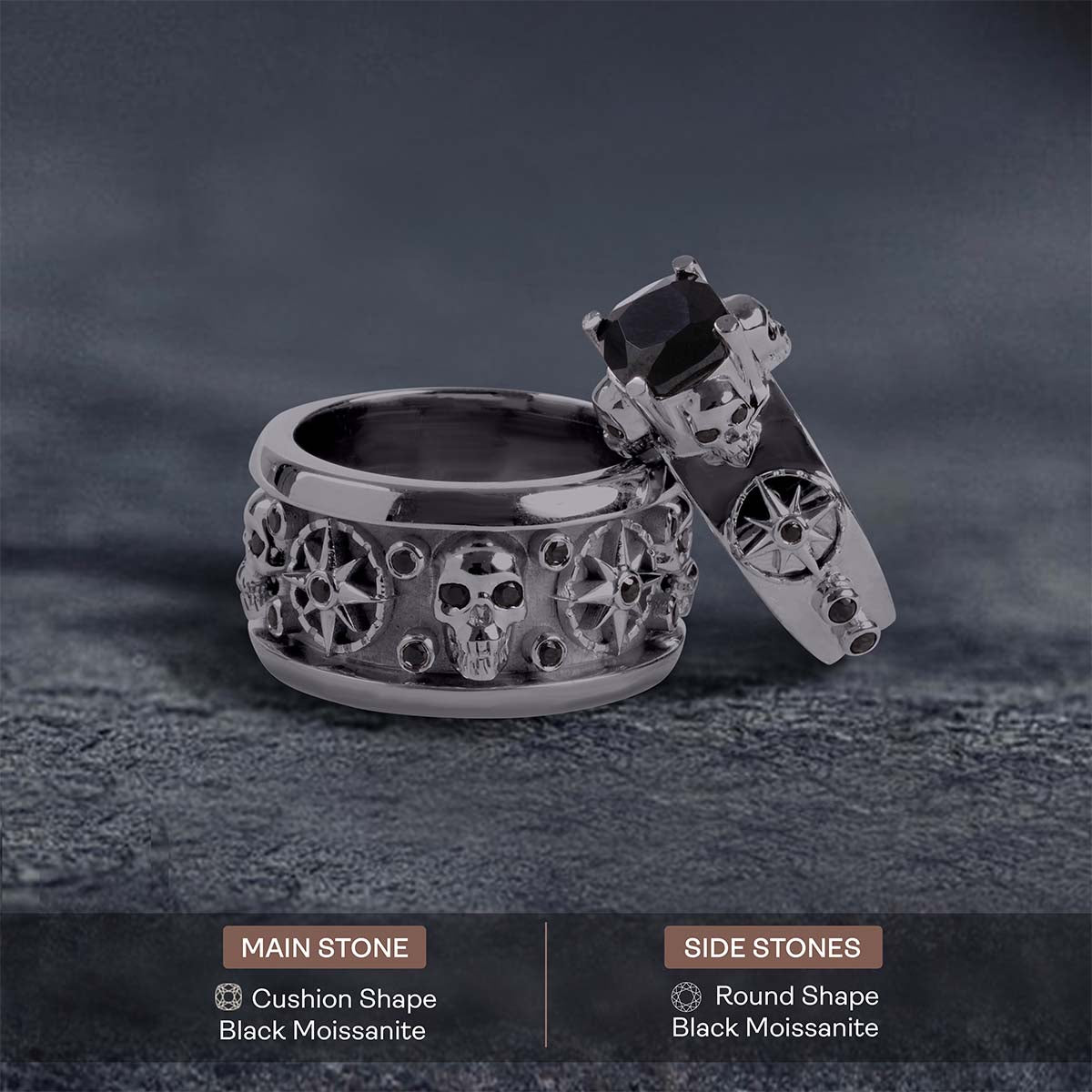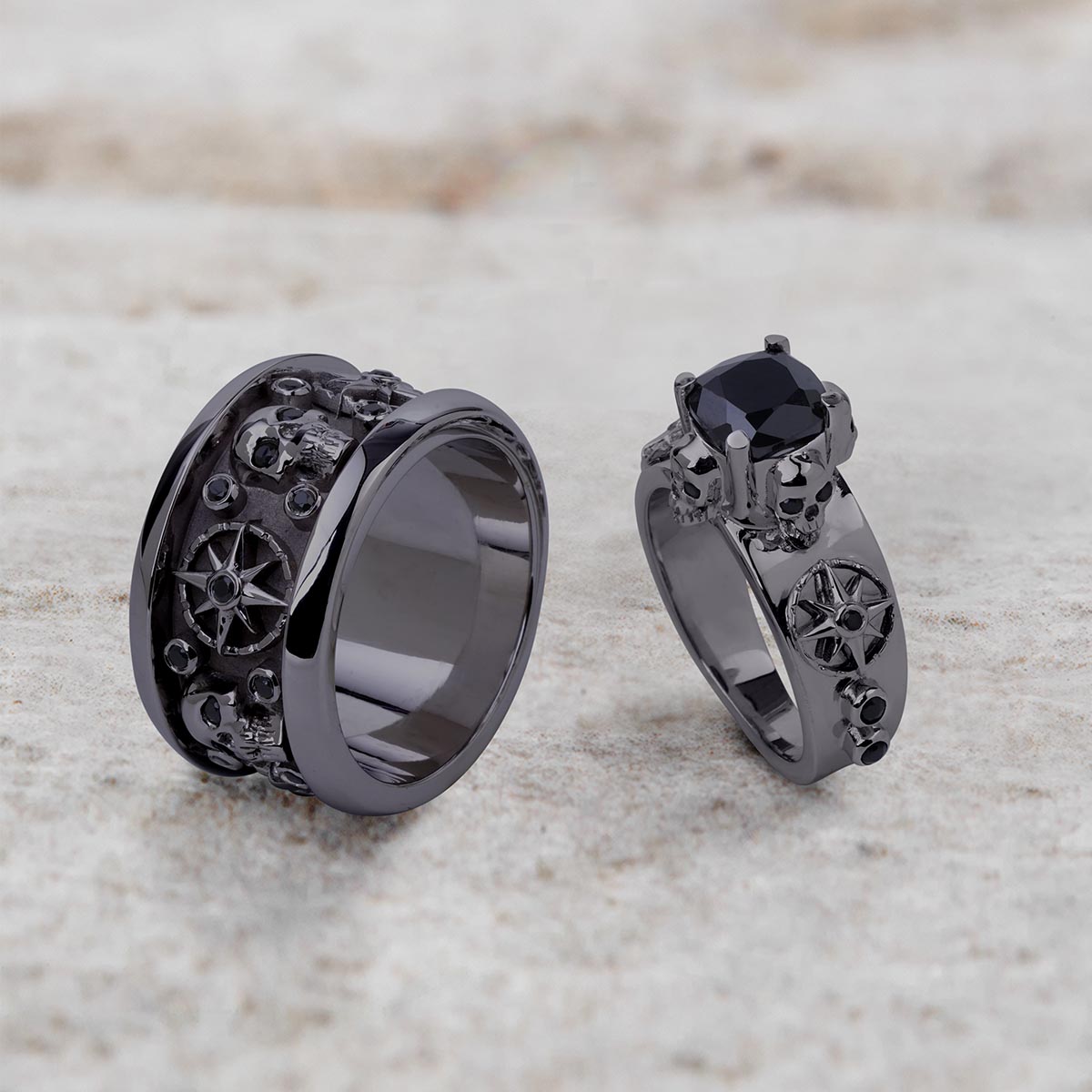 Compass Skull Wedding Rings Black Moissanite His and Her Couple Set