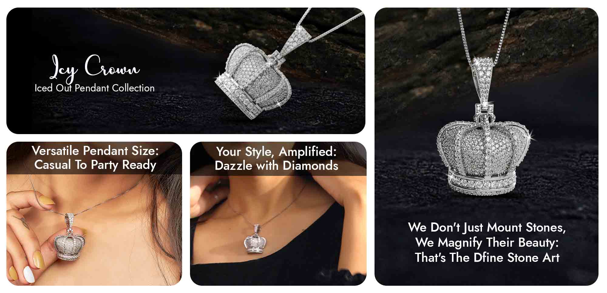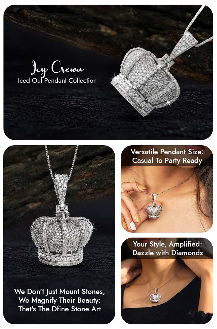 Iced Out Crown Pendant King Queen Crown Necklace Hip Hop Jewelry CZ Diamond