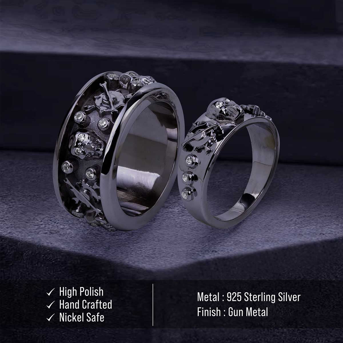 Perfect for a biker couple like us. I am thoroughly impressed with the craftsmanship of these rings. The detail on the mechanic parts and skulls is incredible. Engraving is perfect, and we get so many compliments on the unique design.!