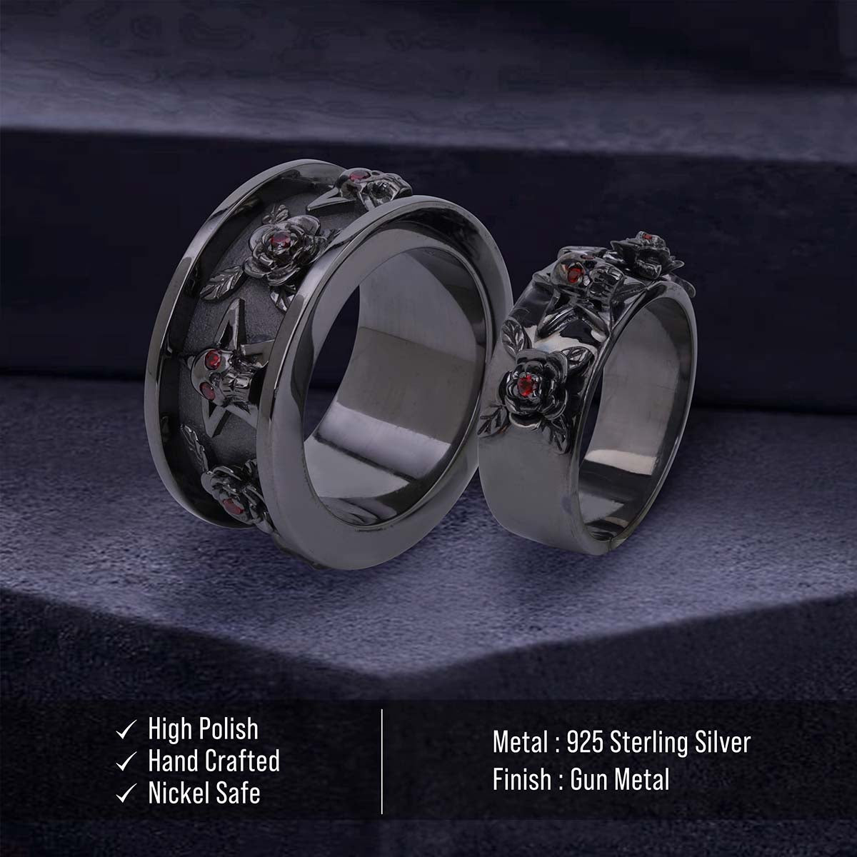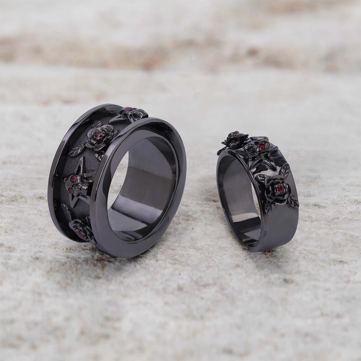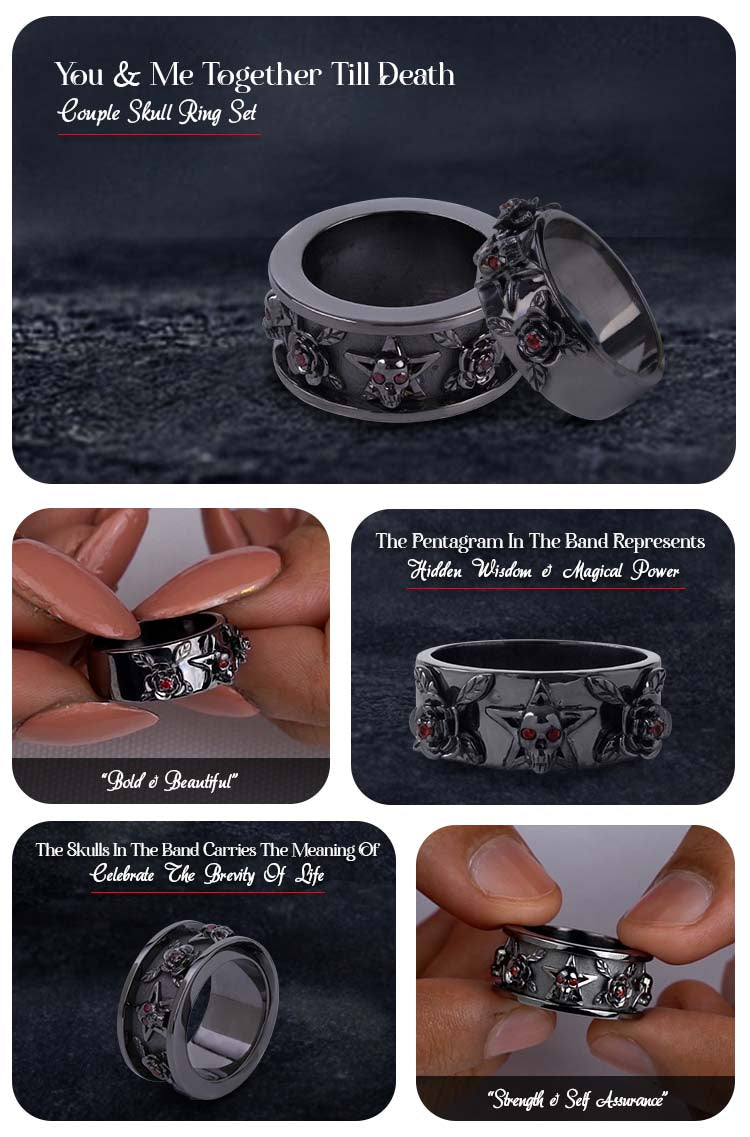 Rose Skull Wedding Bands Gothic Couple Anniversary Ring Set