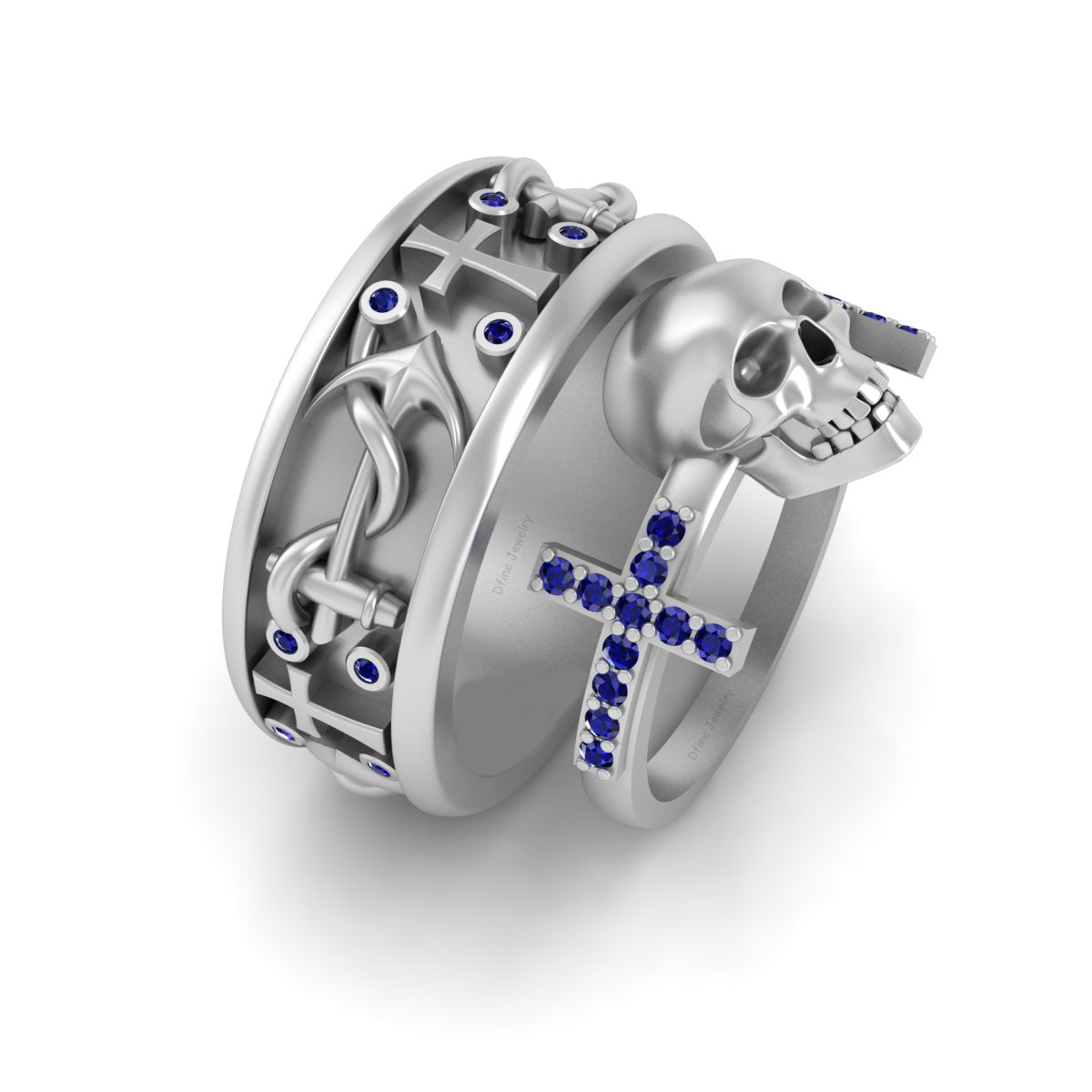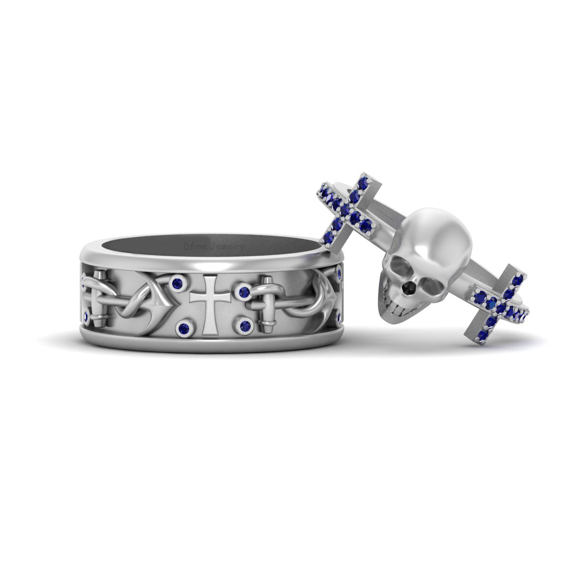 Skull Engagement Ring Anchor Band Set Silver Holy Cross Couple