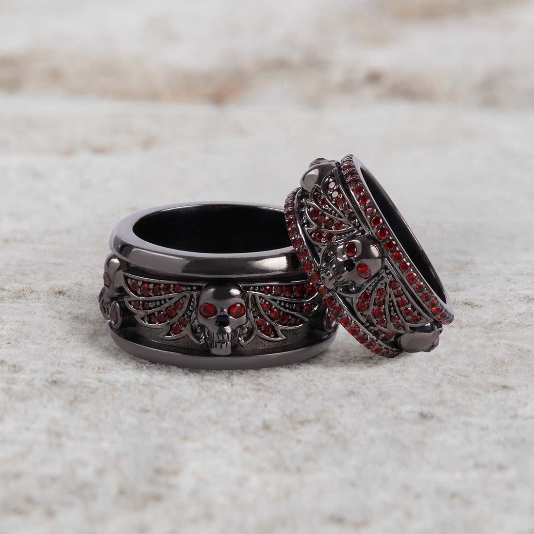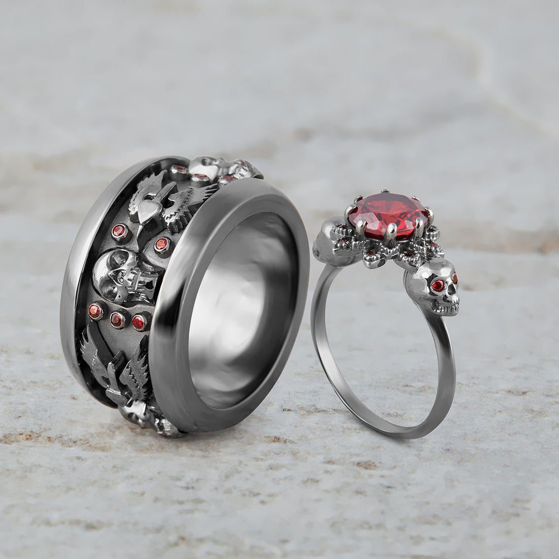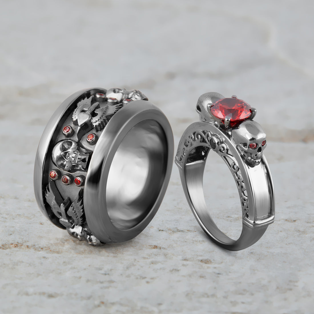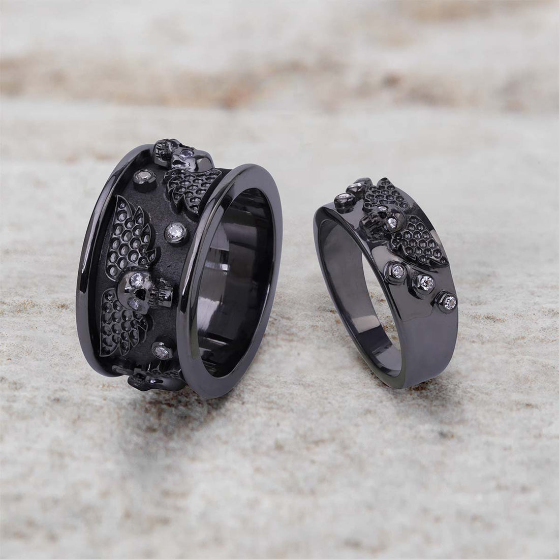 Gothic Skull Engagement Rings His and Her Couple Gun Metal Fn