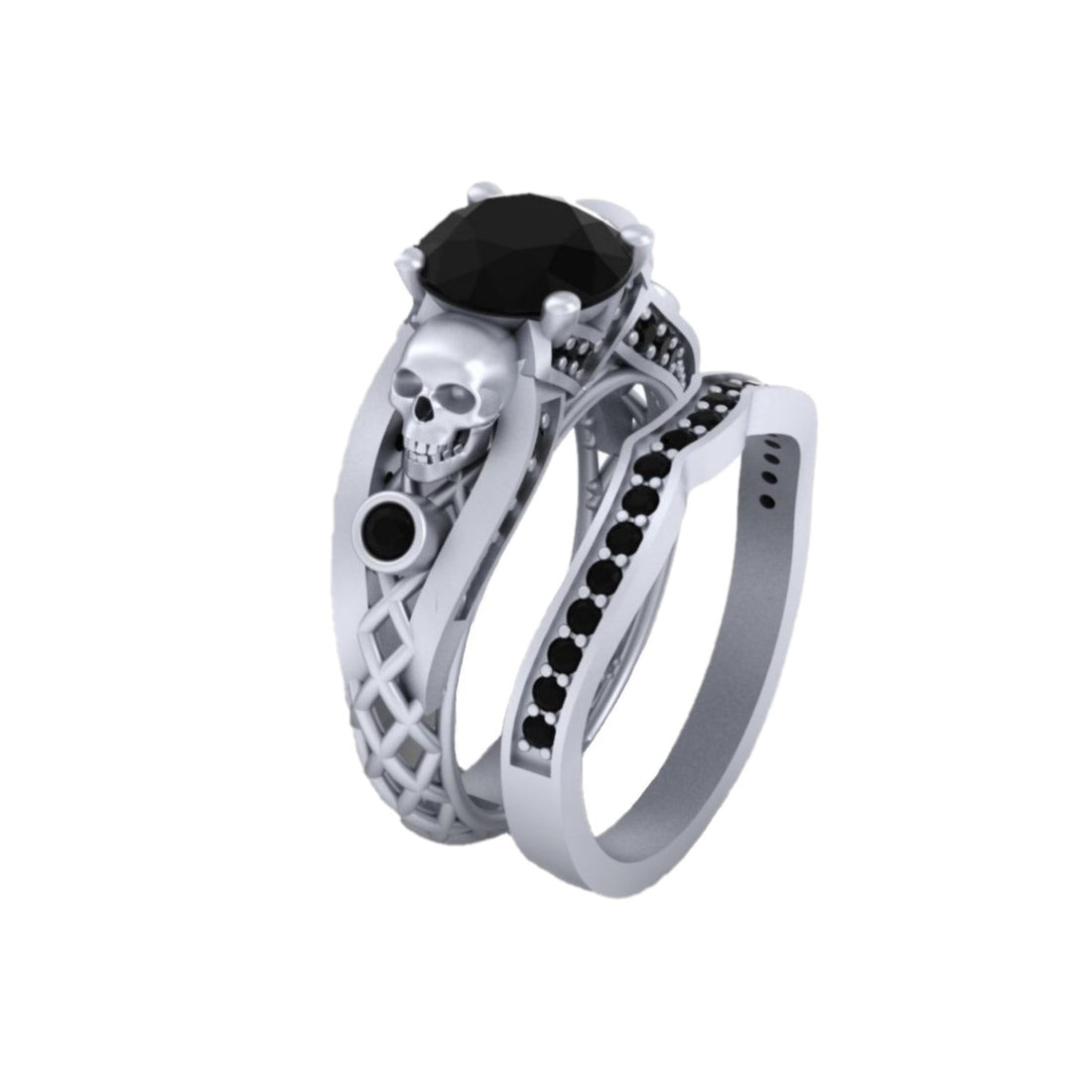 Onyx Skull Wedding Ring Set Mesh Gothic Skull Ring White Gold