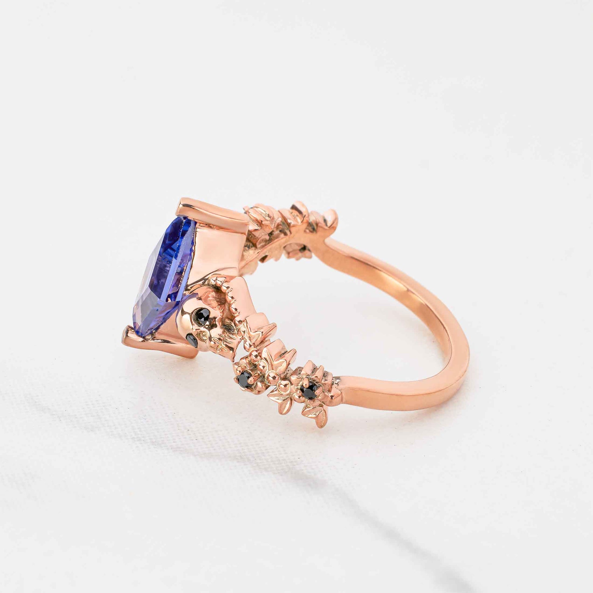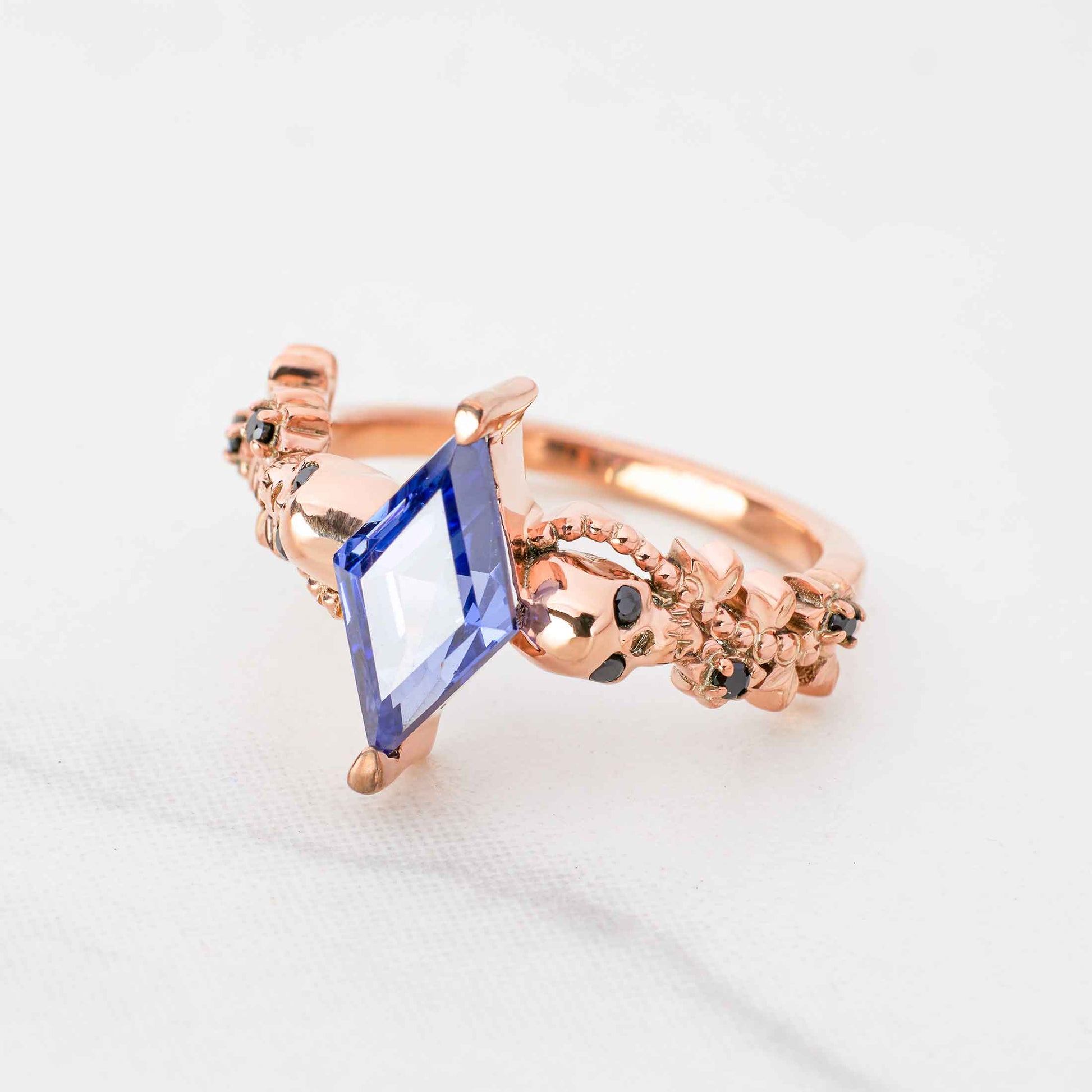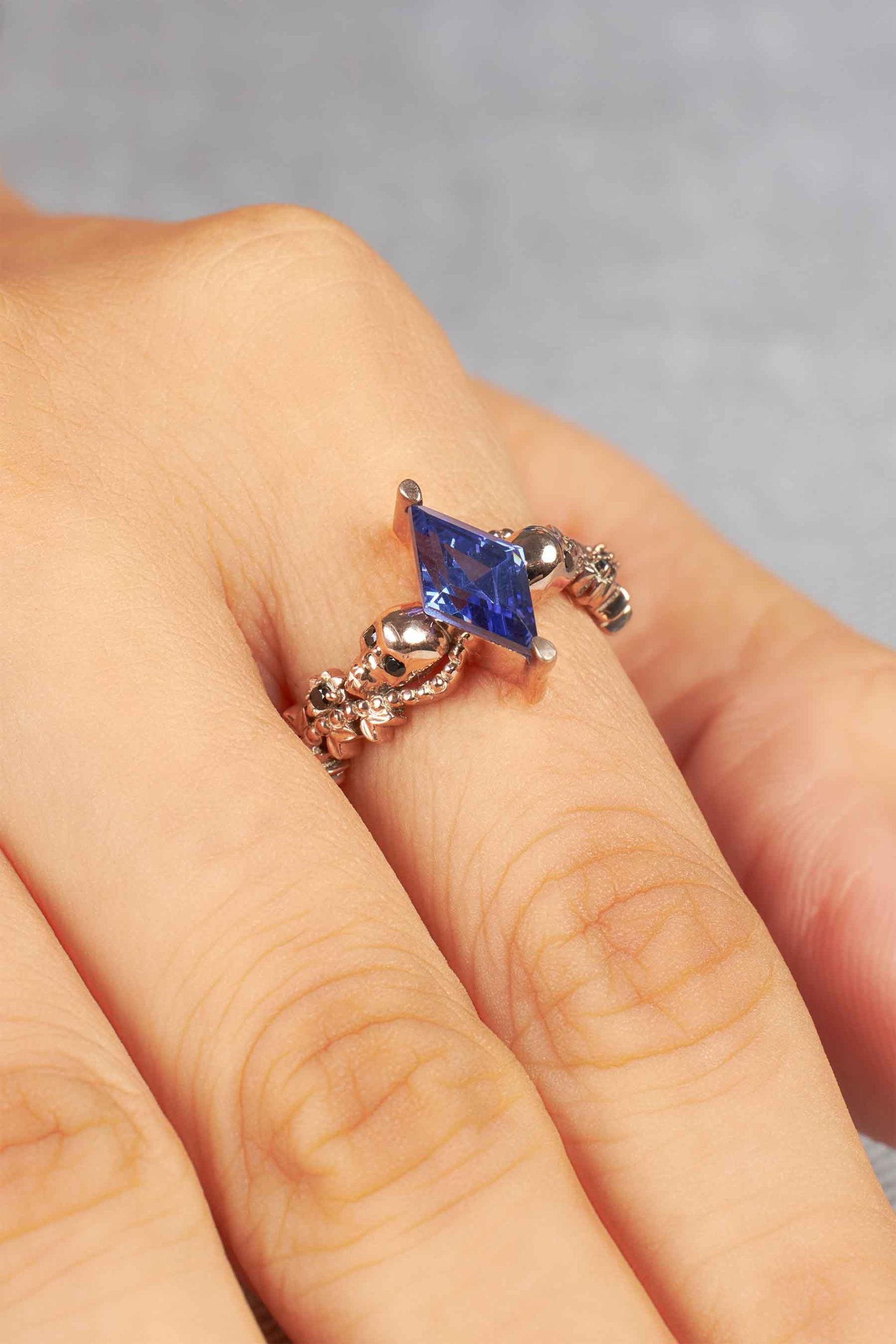 Floral Art Deco Skull Ring Blue Titanic Gemstone Kite Cut Ring