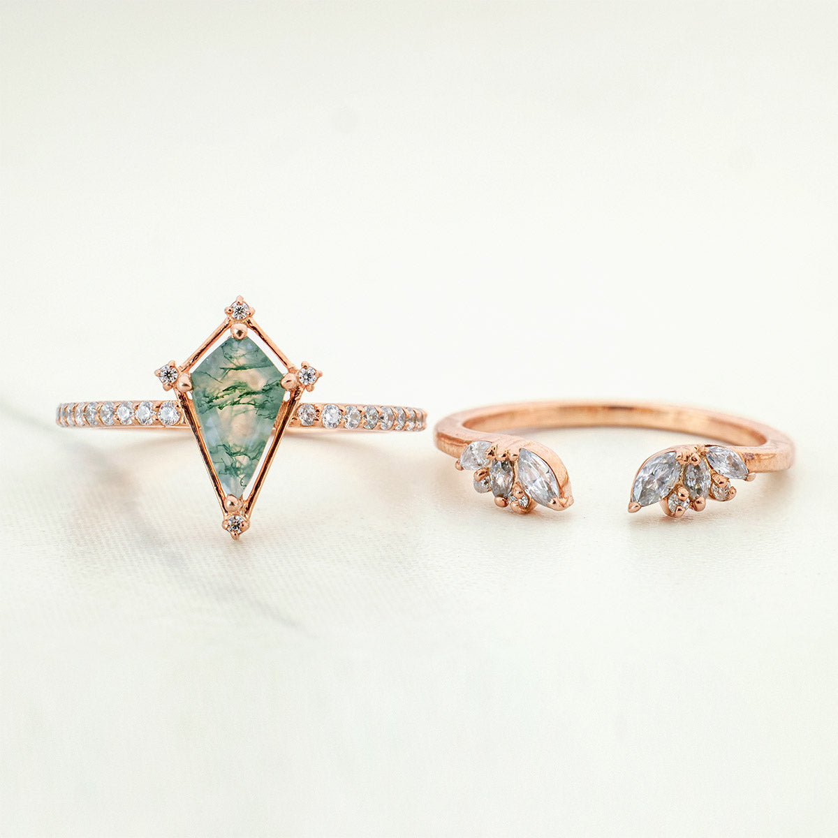 New obsession, moss agate. The stone itself is completely unique and shows the green "moss" so beautifully. It's set nice and the whole ring set is just perfect. Good quality and fits perfect. I just love them. I will order more from this website.