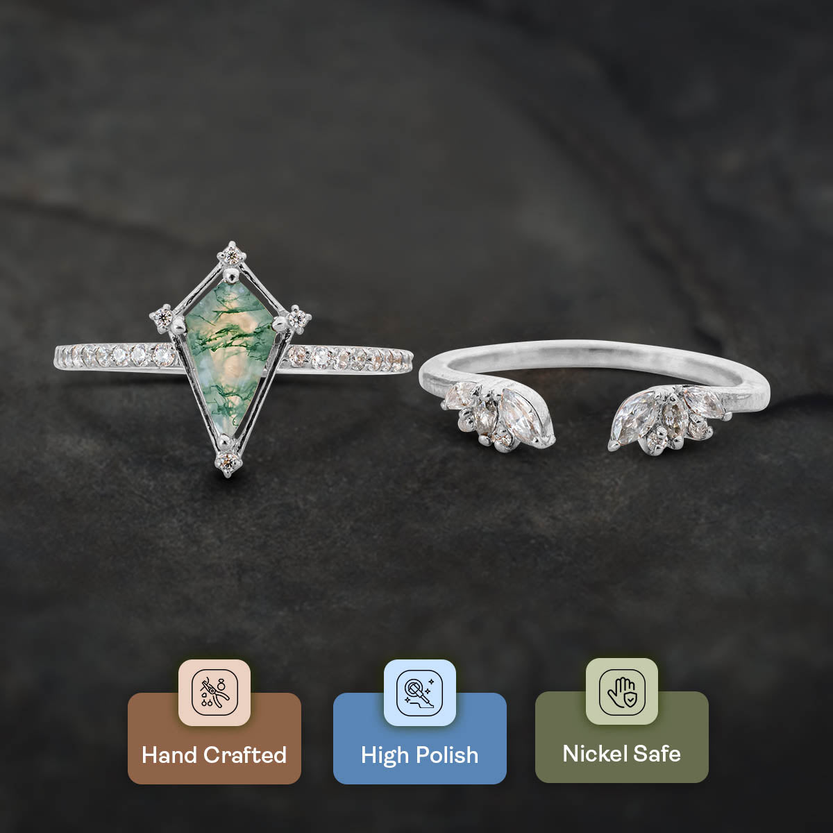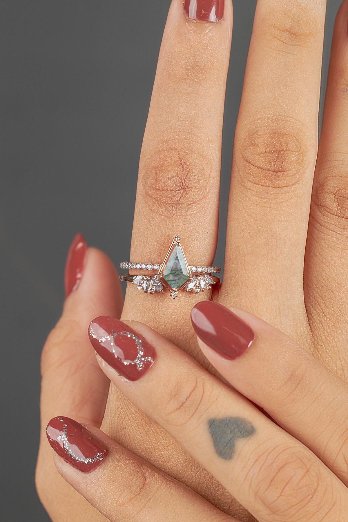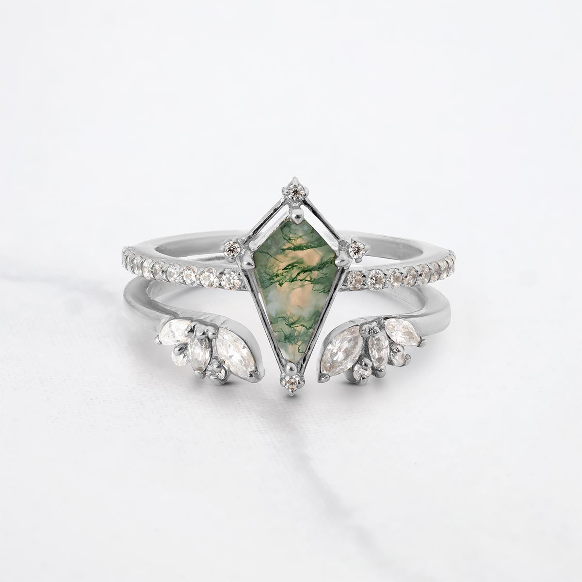 Kite Cut Moss Agate Ring Set Vintage Moissanite Wedding Band