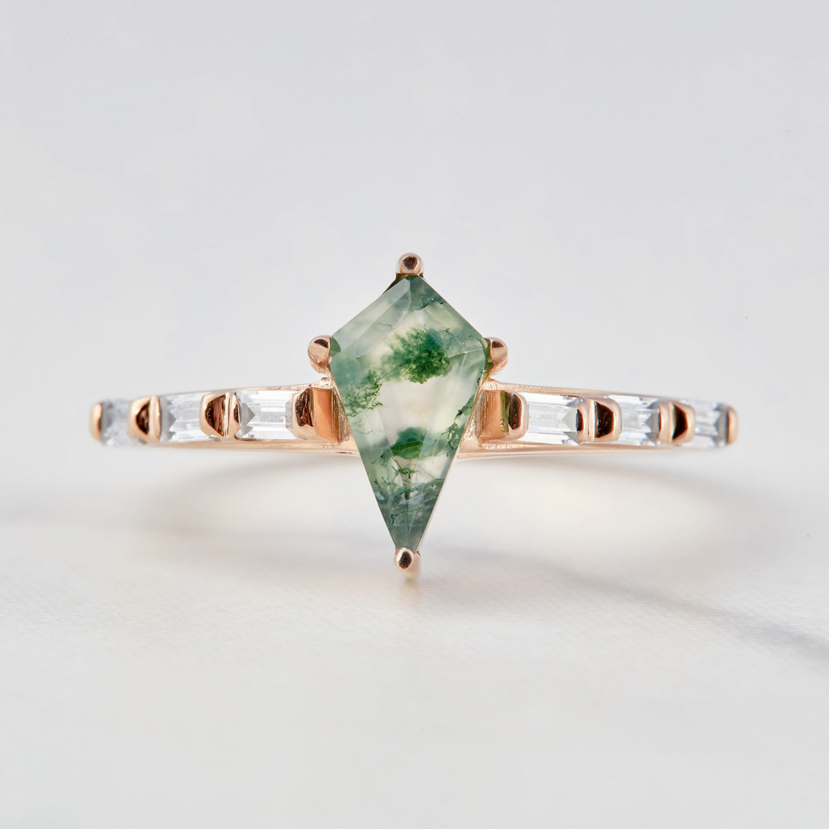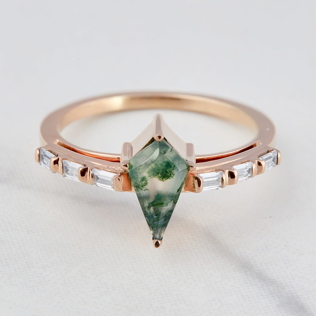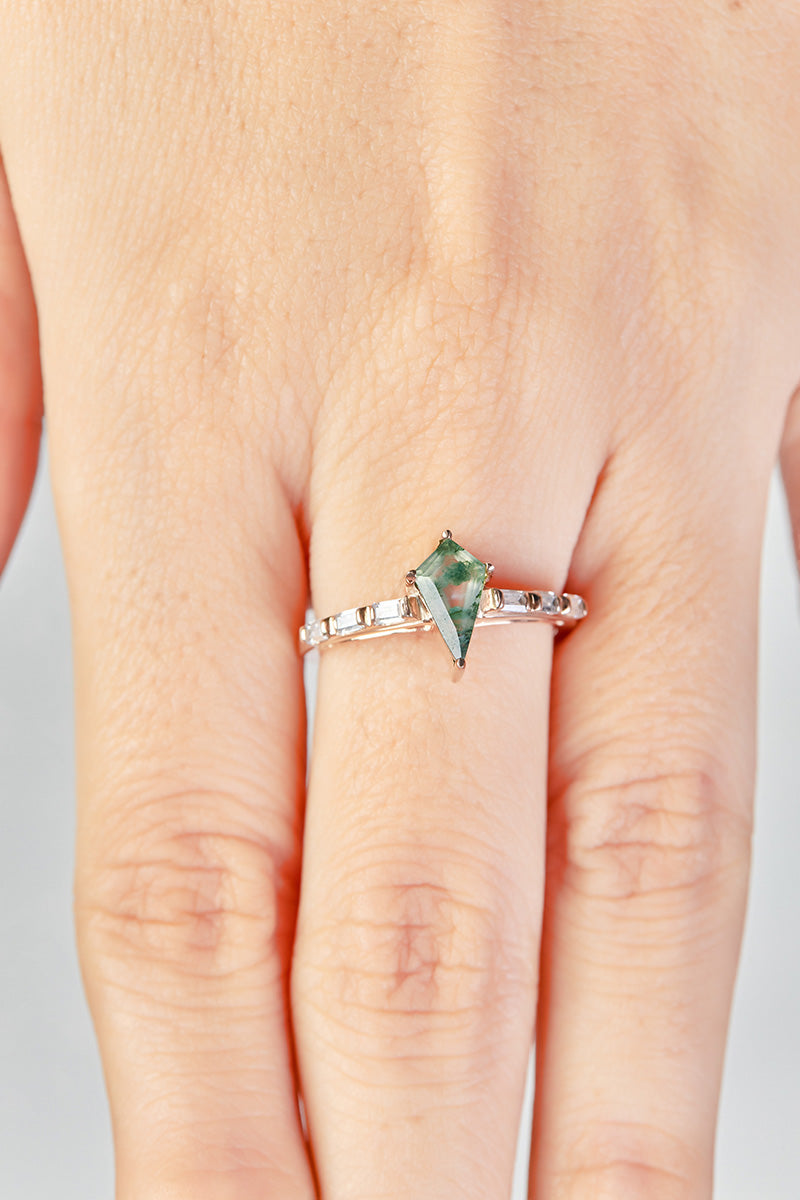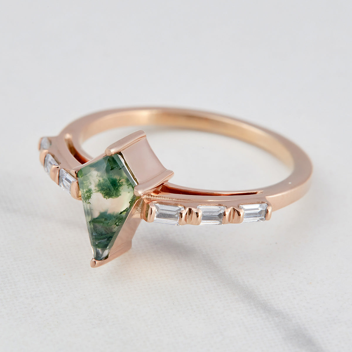 This engagement ring is a dream! The kite cut is so rare, and paired with moss agate, it looks like a one-of-a-kind treasure. The diamonds make it shine beautifully.
