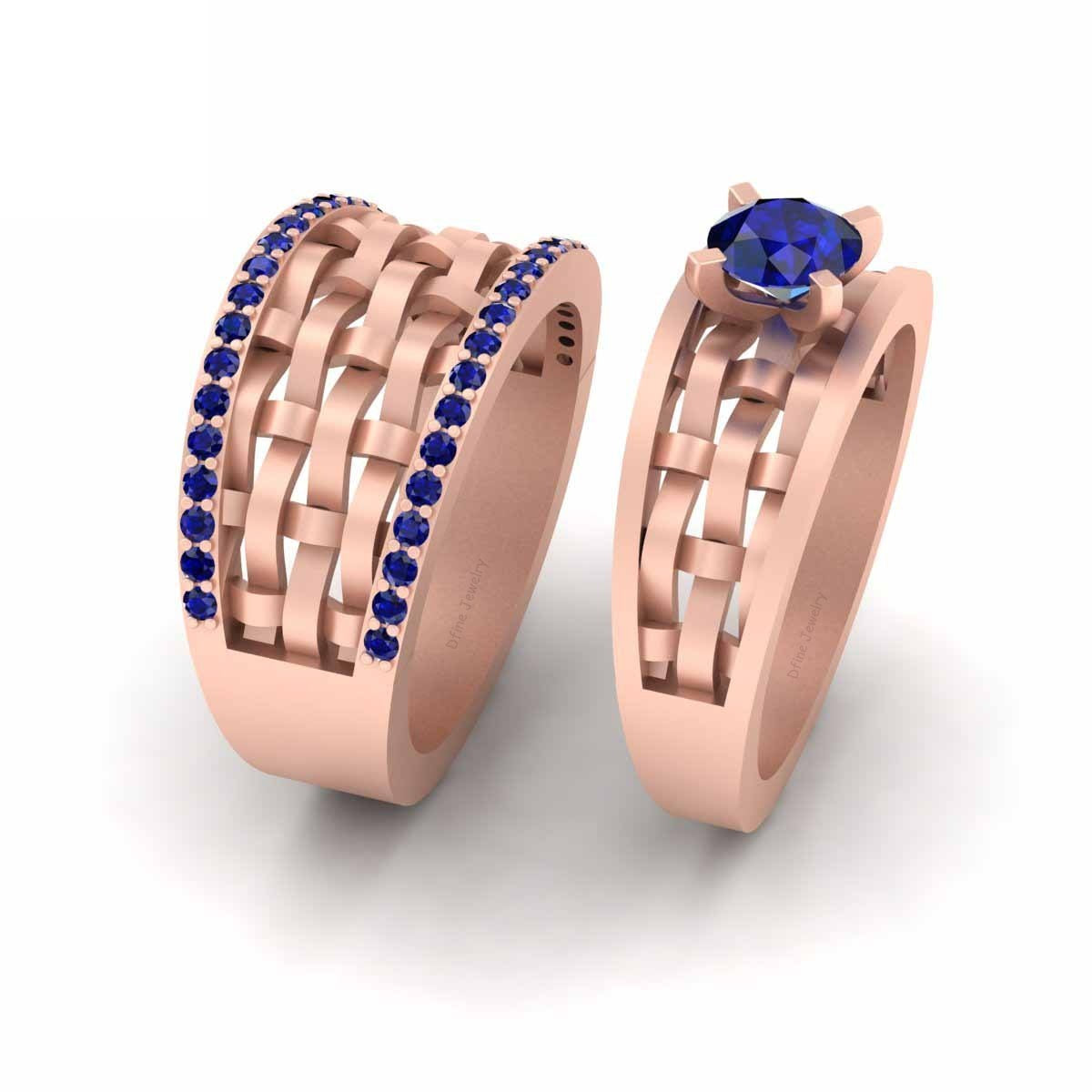 Sapphire Mesh Engagement Rings Rose Gold His Her Couple Set