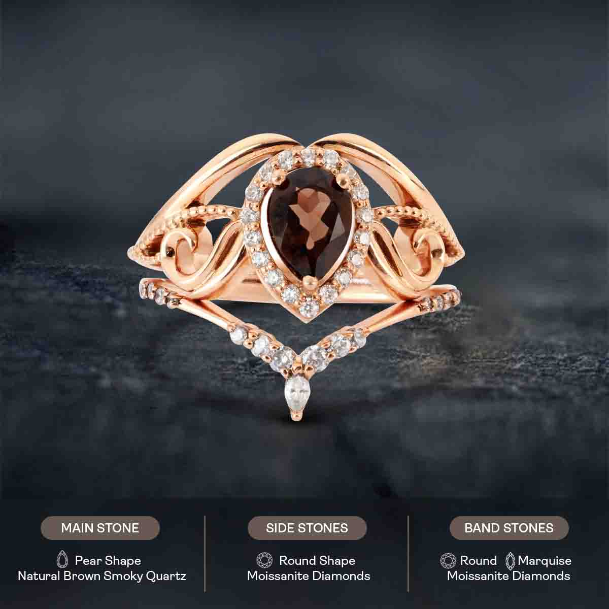Teardrop Smoky Quartz Ring Set Vintage Style Wedding Rings