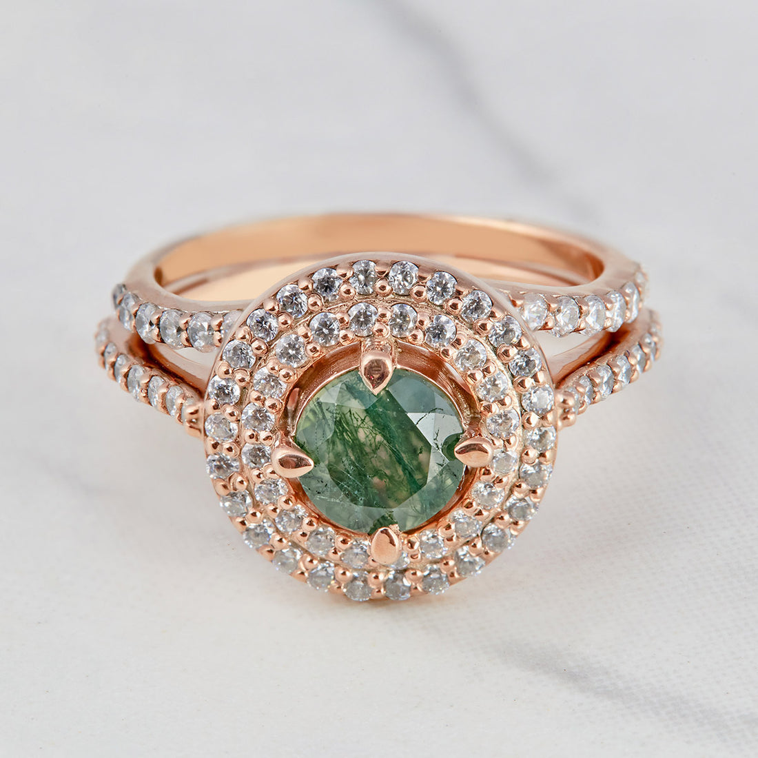 0.80CT Moss Agate Engagement Ring Set Double Halo Moissanite
