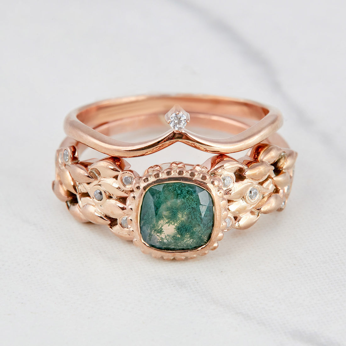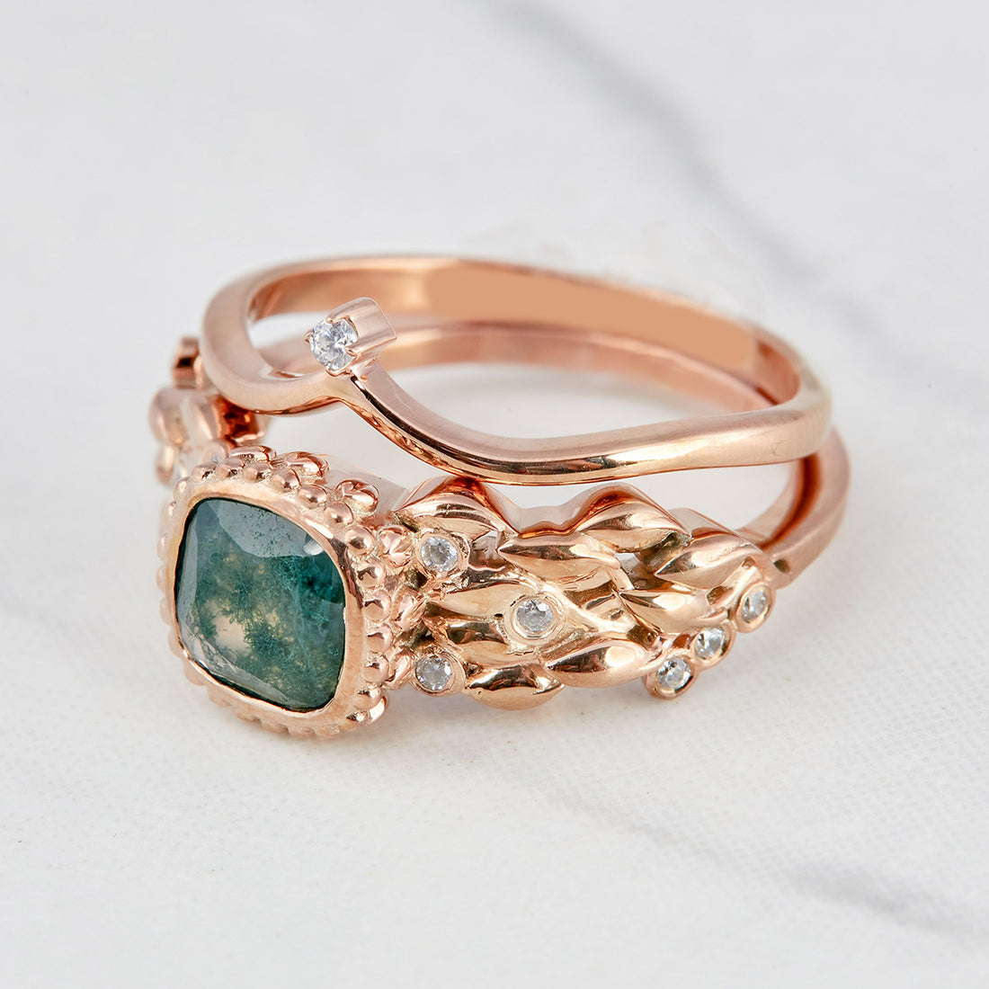 1.10CT Moss Agate Engagement Ring Set Cushion Cut Leaf Floral
